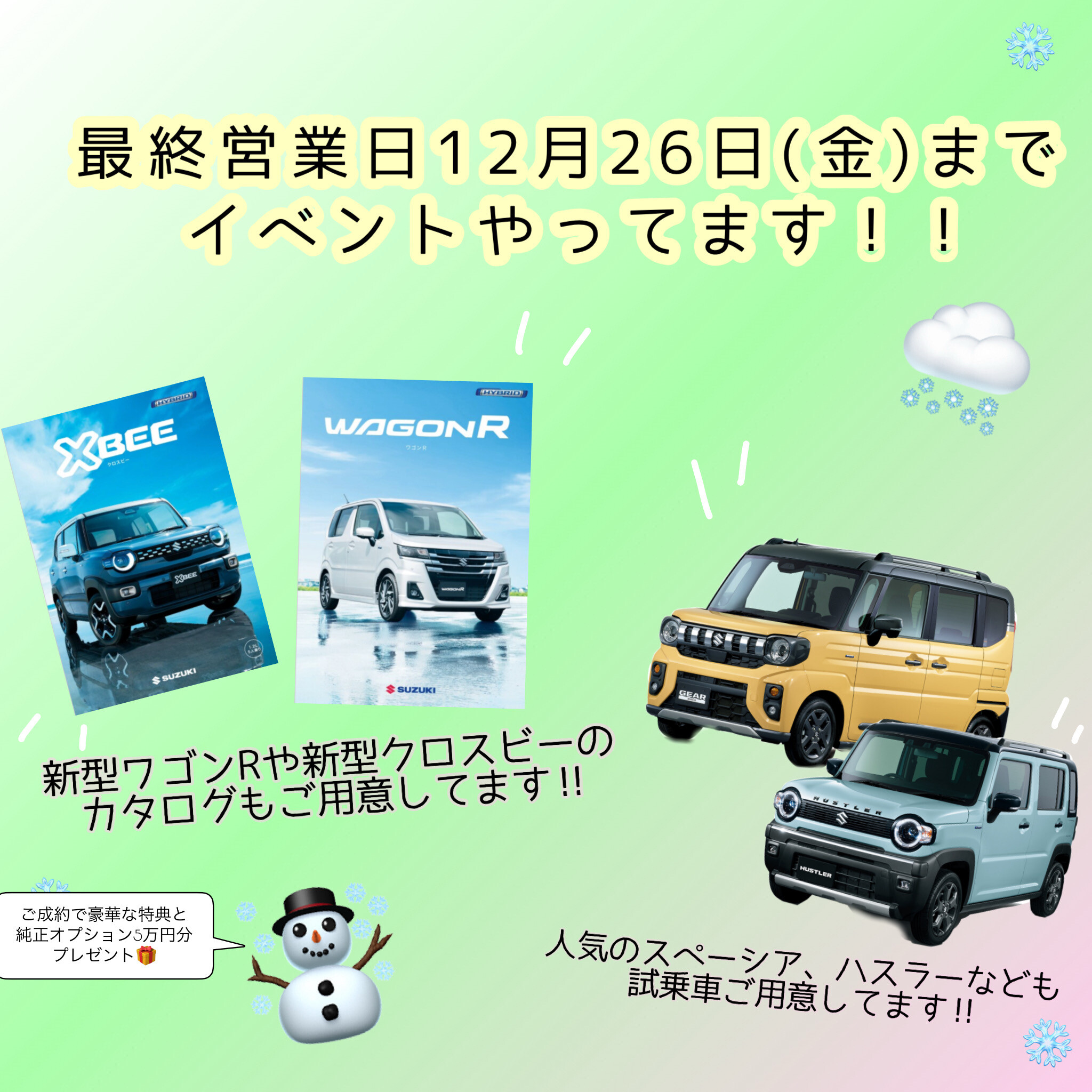 イベント/キャンペーン 2025.12.18 営業日最後の週末イベントです!!!! みなさんこんにちは! スズキアリーナ豊川東です 12月も中旬です!!今年も残りわずか! 悔いなく1年締めくくりたいですね 現在先行初売り実施中です 営業日最後の週末です!!! 12月1日(月)~12月26日(金)まで 営業稼働の最終日までやっています!! 豪華なご成約特典&純正オプション5万円プレゼント 先日ご案内させて頂いた新型ワゴンRのご相談も承っております!! カタログもご用意しております!! この機会にしかないチャンスです 皆様のご来店スタッフ一同 心よりお待ちしております(^^♪