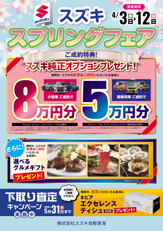 イベント/キャンペーン 2026.04.09 スズキスプリングフェア!12日まで開催中! いつも当店をご愛顧いただきありがとうございます! スズキアリーナ蒲郡店です! スズキ スプリングフェア のご案内です! 4月12日まで開催します! 期間内の成約特典として、 オプションプレゼントと選べるグルメギフト をご用意しております! 同時に下取り査定キャンペーンも5月31日まで実施しております! 査定していただくと、ネピアエクセレンスティッシュをプレゼントしております! スタッフ一同、皆様のご来店をお待ちしております!