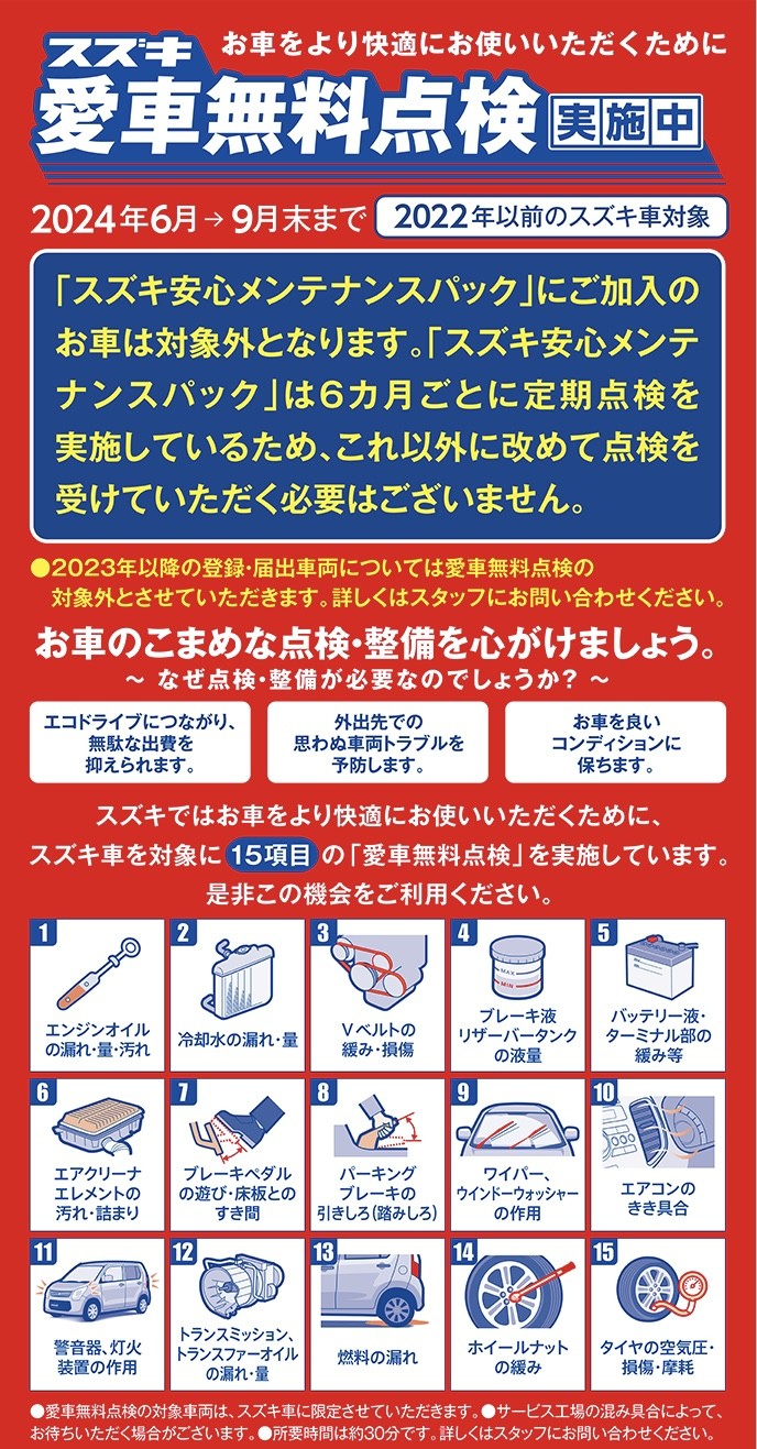 スズキサービススタッフが15項目を無料で点検します