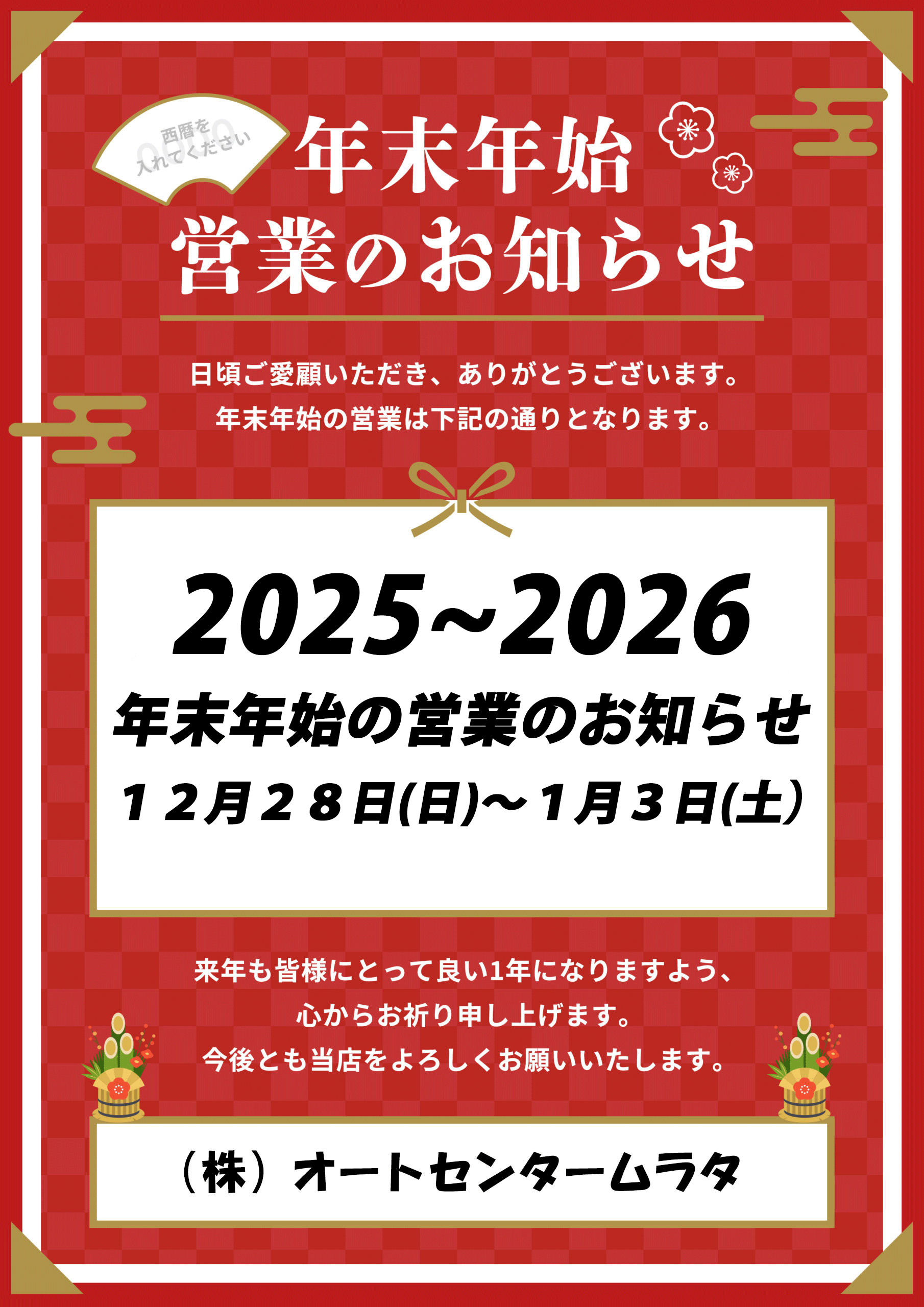 誠に勝手ながらオートセンタームラタは下記の期間を年末年始休暇とさせていただきます。