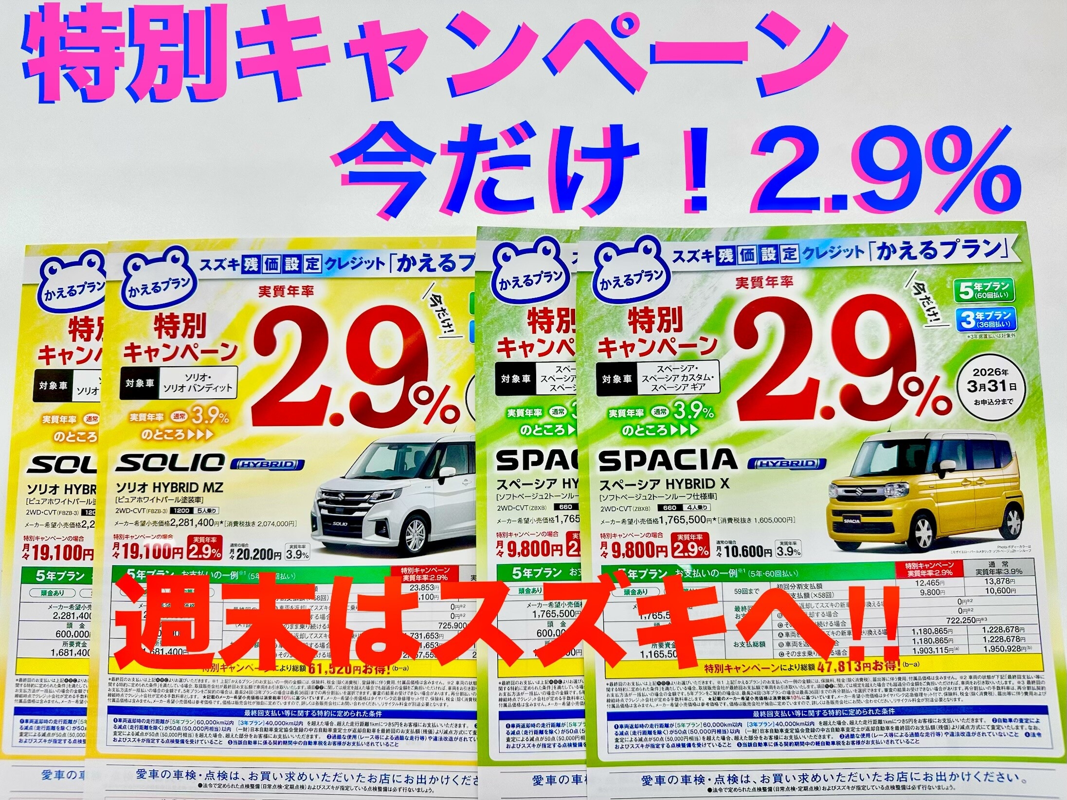 その他 2026.02.19 今ならかえるプランがお得! みなさんこんにちは スズキアリーナ宇治です ☆スペーシア☆ソリオ☆クロスビーだけ! かえるプラン特別金利2.9% こんなにお得な金利は今だけです! ~~2026年3月31日まで~~ ご検討の方は是非!!!お早めに!!
