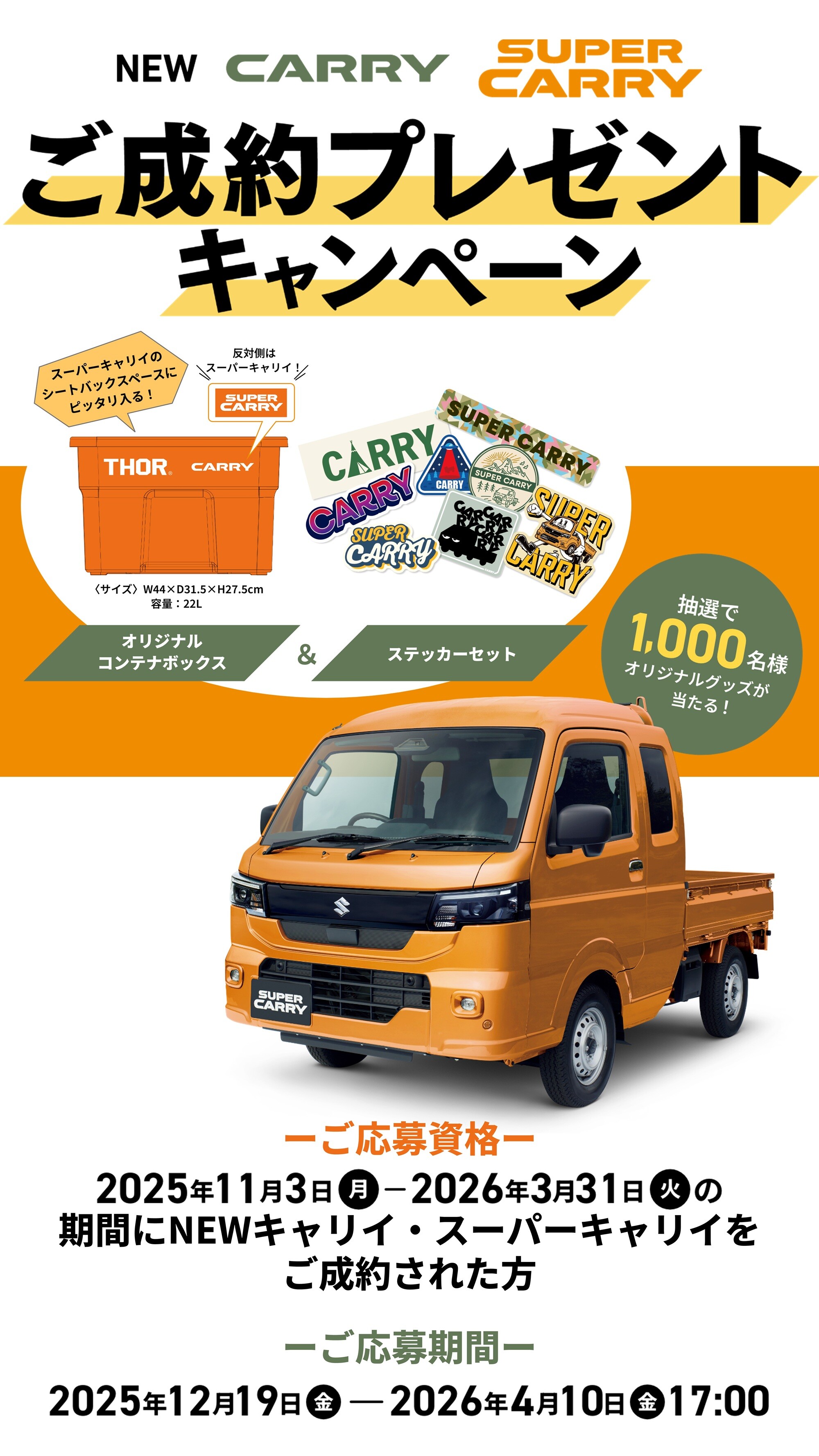 新車情報 2026.01.20 キャリイが新しくなって新登場!!!週末はぜひアリーナ東住吉へ! みなさまこんにちは! 新人のおおたはらです! キャリイが新しくなって新登場しました! 新しくなったキャリイには、魅力がたくさん! 全車LED搭載! 安全装置もたくさんついてきます! 車線逸脱機能や標識認識も新しく備わりました! デザインも大きく変更され かっこいい見た目になりました! また期間中にNEWキャリイのご成約の上、ご応募いただくと 抽選でオリジナルグッズをプレゼント! 応募期間:2025年12月9日(金)~2026年4月10日(金) ぜひこの機会にご応募ください! またアリーナ東住吉にはたくさん試乗車のご用意がございます。 少しでも気になるお客様! ぜひアリーナ東住吉へお越しください! みなさまのご来店お待ちしております!