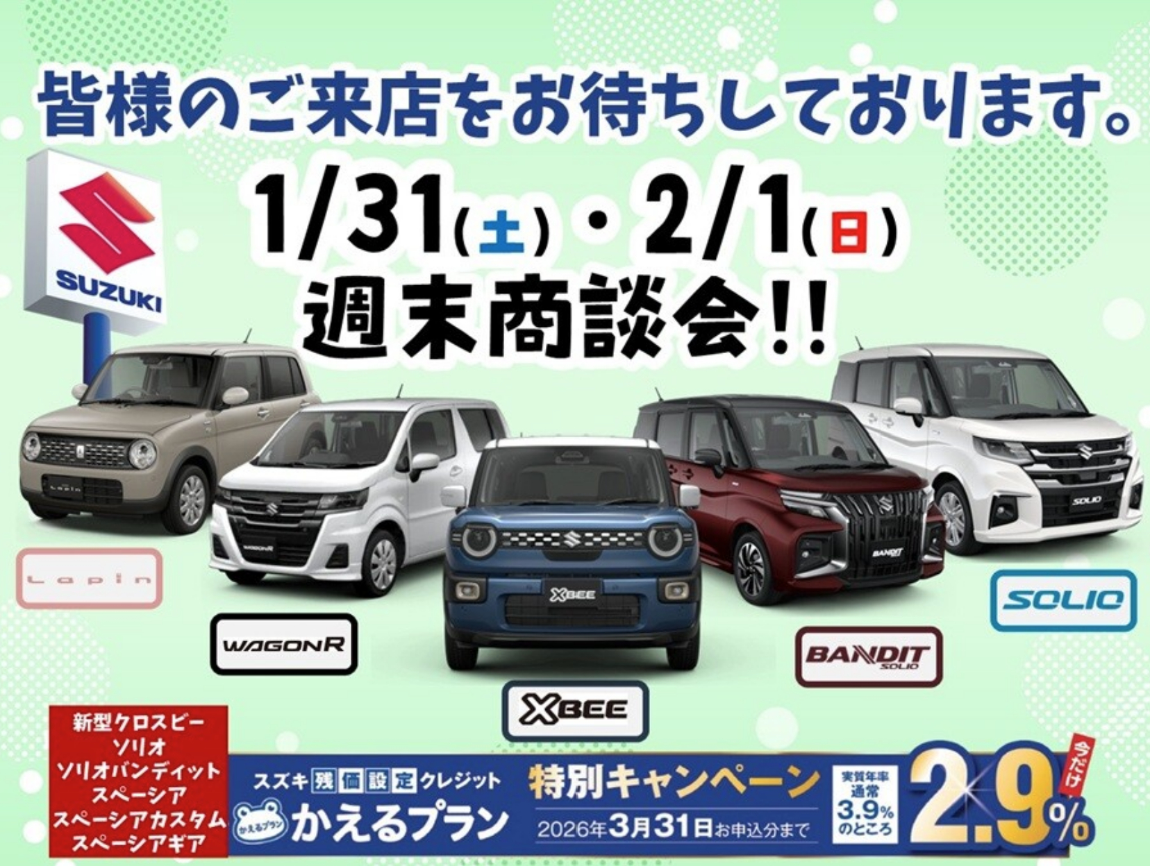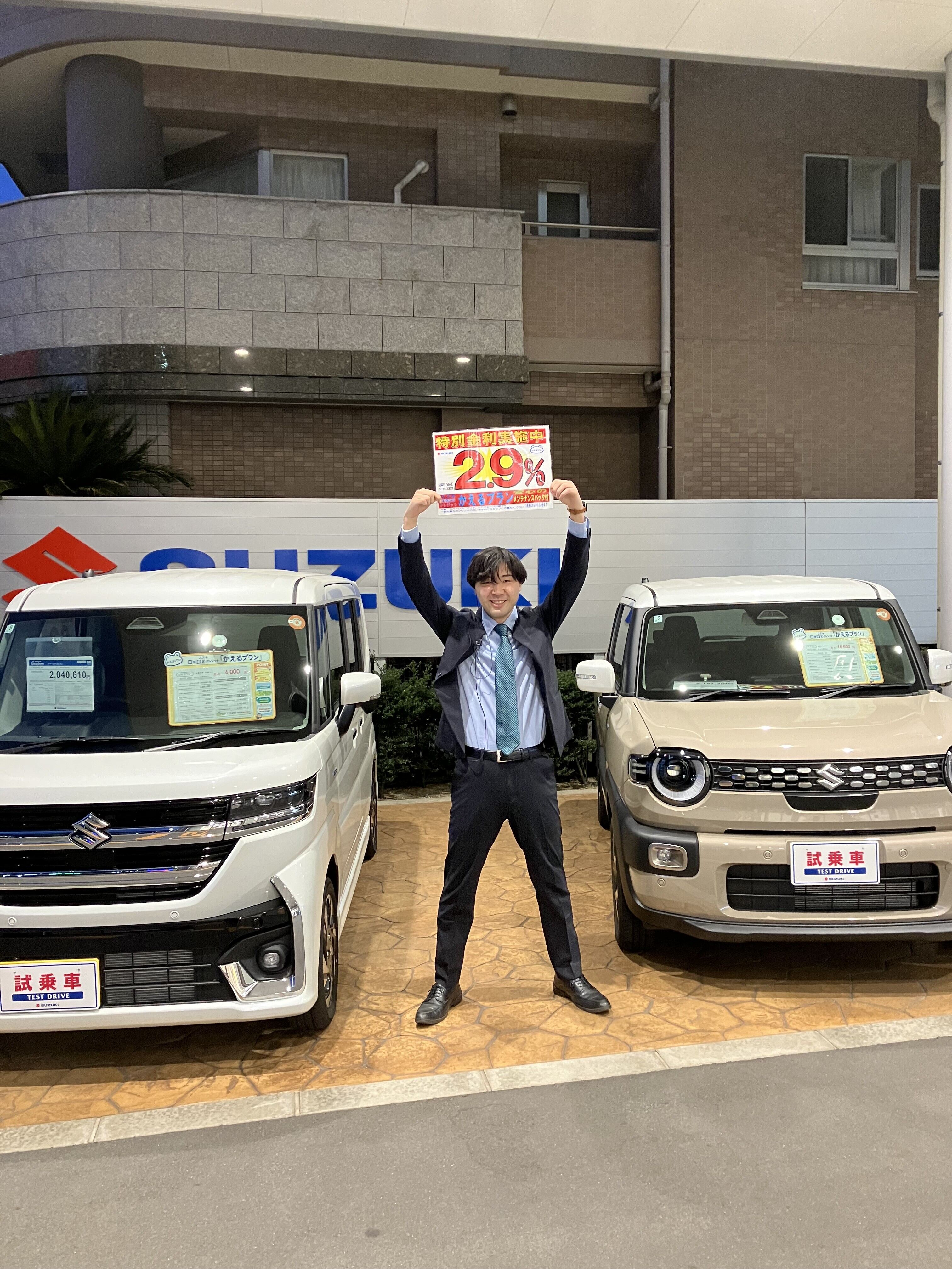 イベント/キャンペーン 2026.01.26 週末商談会実施します!!! キャンペーン期間:2026.01.31~2026.02.01 みなさまこんにちは! 新人のおおたはらです! 今月最終と2月最初の商談会を実施します! お得なキャンペーンのご紹介です! スズキの残価設定クレジットの「かえるプラン」が 通常金利3.9パーセントのところ 3月31日までにご注文いただいたお客様に 特別金利2.9パーセント でご案内させていただきます! 対象車種 新型クロスビー ソリオ ソリオバンディット スペーシア スペーシア カスタム スペーシア ギア また! スペーシア、ソリオには とてもお買い得なワンプライス車がございます! お得な特別金利!お得なワンプライス車も盛りだくさん! ぜひこの機会にアリーナ東住吉店にお越しください! みなさまのご来店お待ちしております!