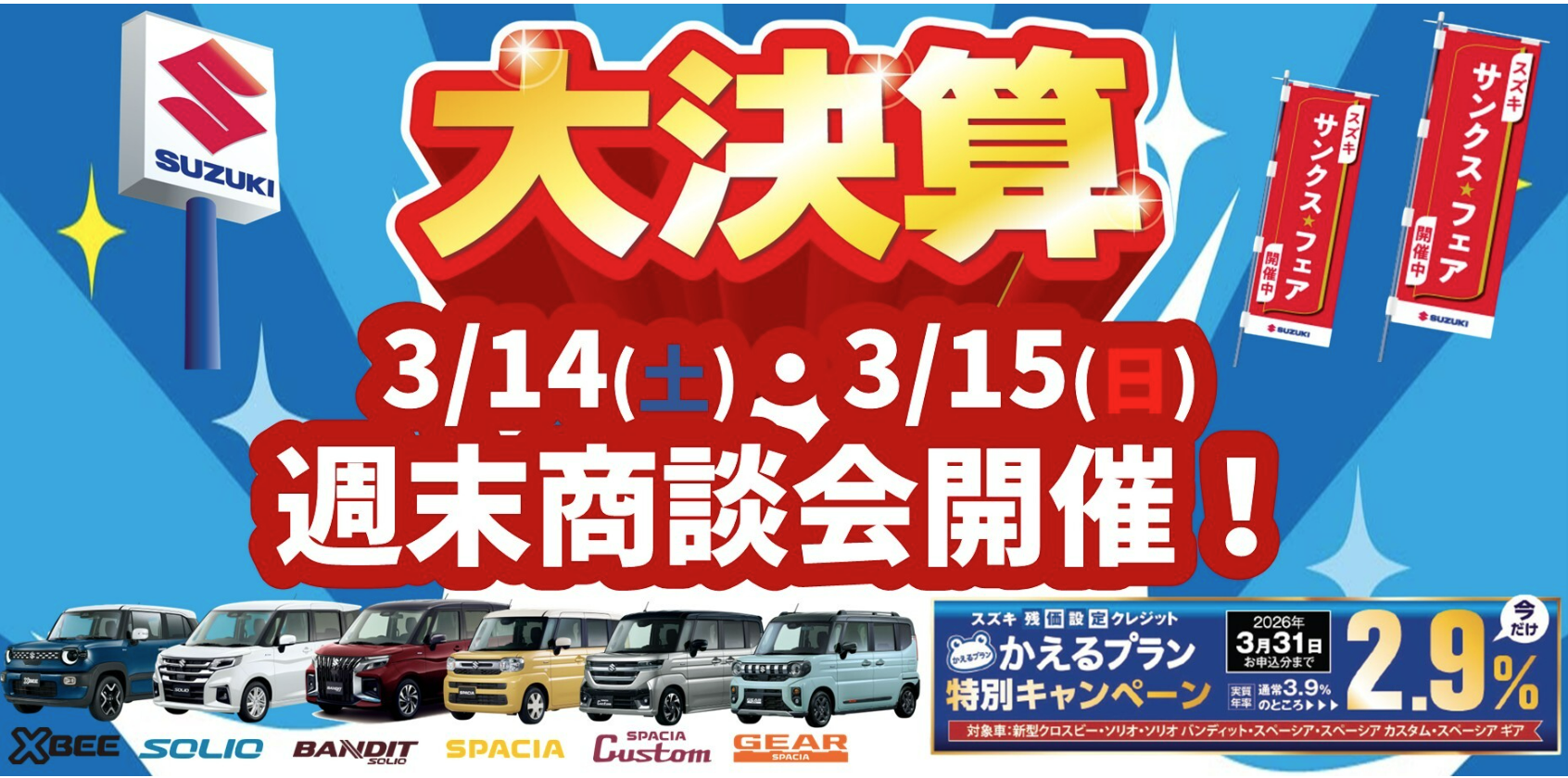 イベント/キャンペーン 2026.03.10 週末はぜひ!アリーナ東住吉へ! みなさまこんにちは 新人のおおたはらです! 今週末も週末商談会を実施します 3月14日(土)15日(日) また! 3月31日までとなりました! スズキの残価設定クレジットである かえるプラン 通常金利3.9パーセントのところ 特別金利で2.9パーセントと 大変お得となっております! 対象車種 新型クロスビー ソリオ・ソリオバンディット スペーシア・スペーシアカスタム・スペーシアギア それだけでなく! ソリオ・スペーシアには スズキ自販近畿限定のワンプライス車のご用意がございます! 全方位カメラ付きのナビ・フロアマット・ナンバープレートリム・ロックボルト・ ETC・ドライブレコーダー・ボディコートがついて 大変お得です! 新年度ももうそろそろです! 少しでも気になるお客さま! ぜひ!この機会にアリーナ東住吉へお越しください! みなさまのご来店お待ちしております!
