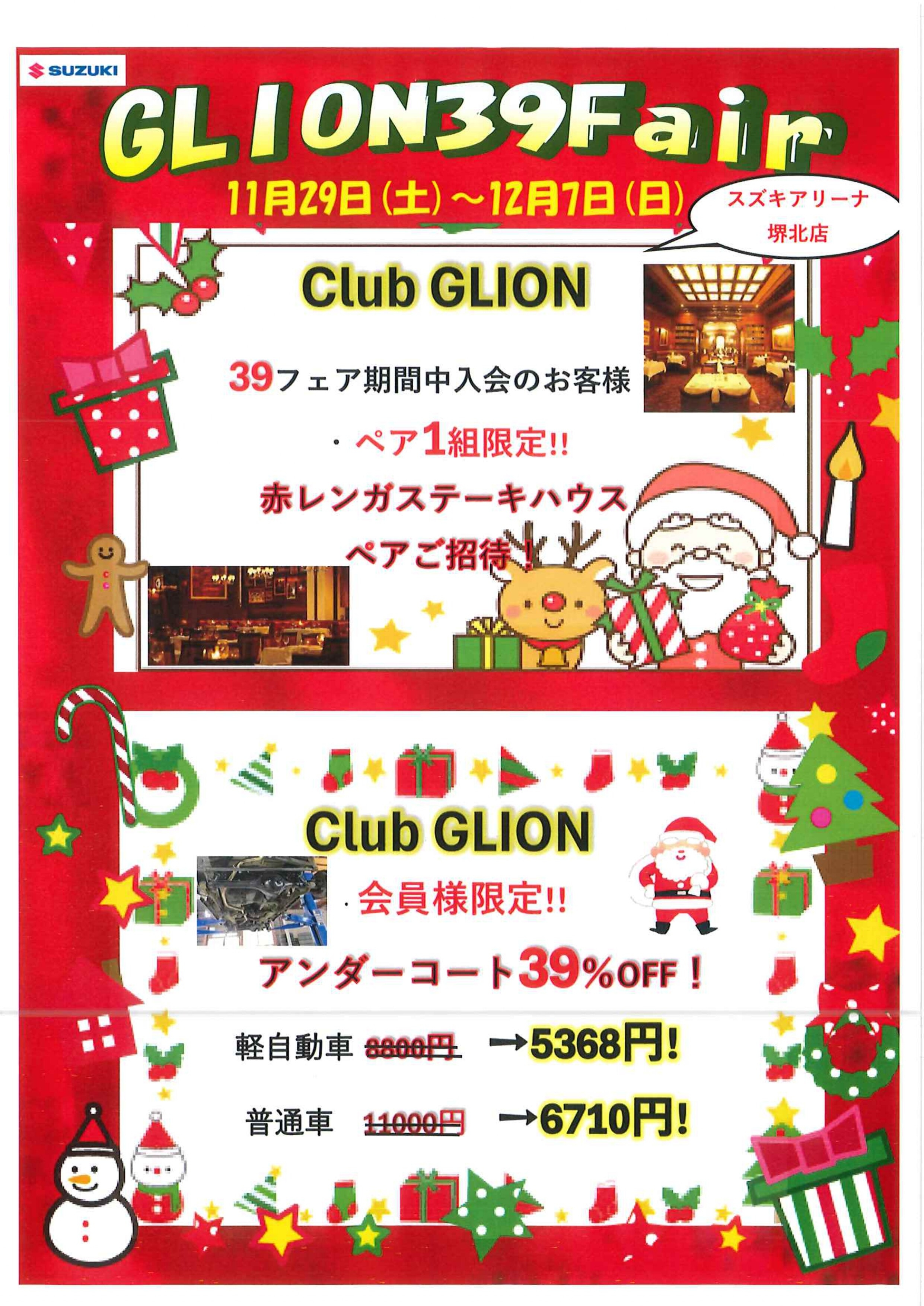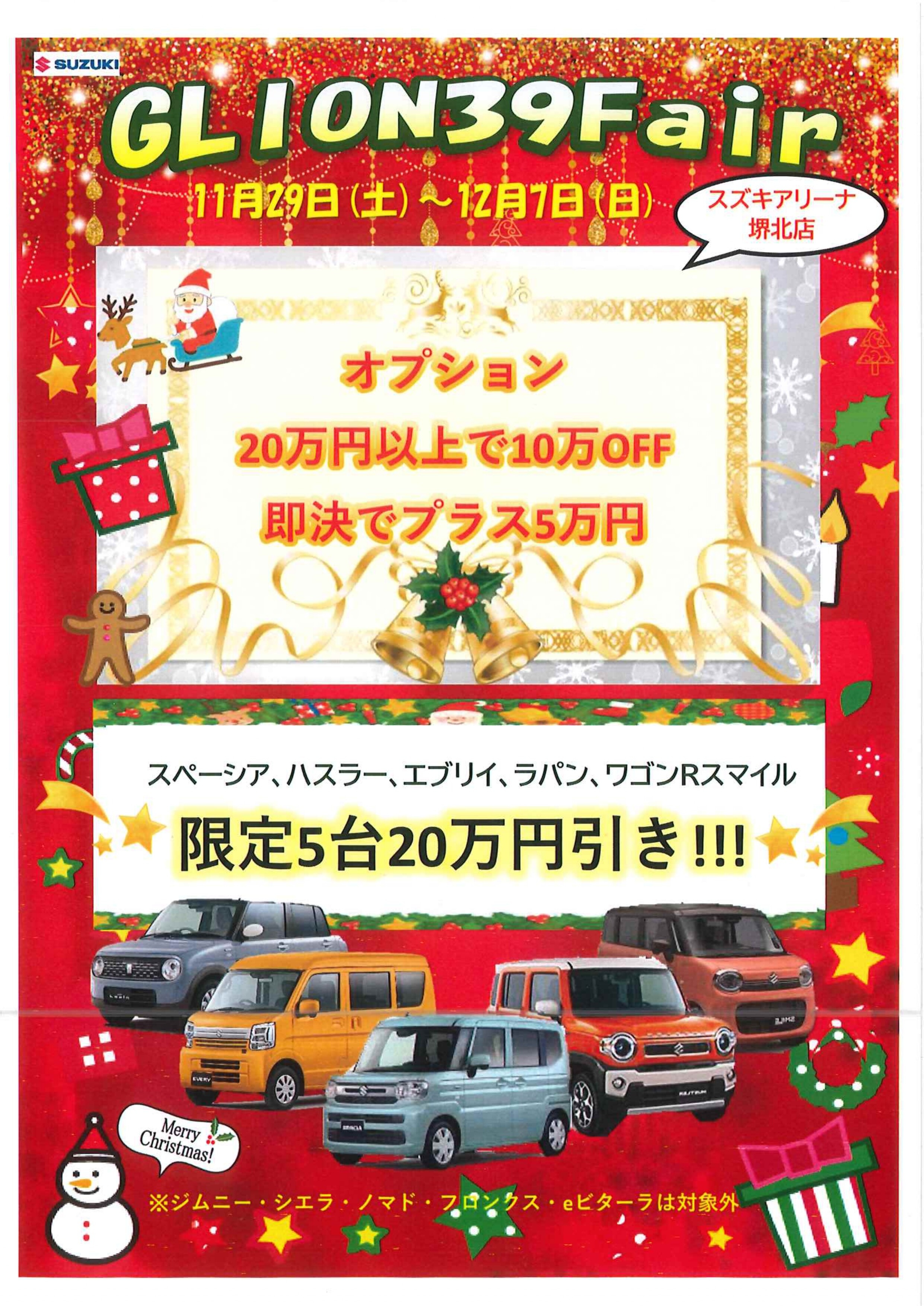 イベント/キャンペーン 2025.11.25 Glion39fair開催 こんにちは スズキアリーナ堺北店です! 今週末から GLION39フェア開催 CLUBGLION会員様限定商品や豪華なオプションパックをご用意! もちろんCLUBGLIONはすぐに入会可能 クリスマスや年末年始にかけて 忙しくなる前にご購入の検討を ぜひこの機会にスズキアリーナ堺北店へお越しください!!