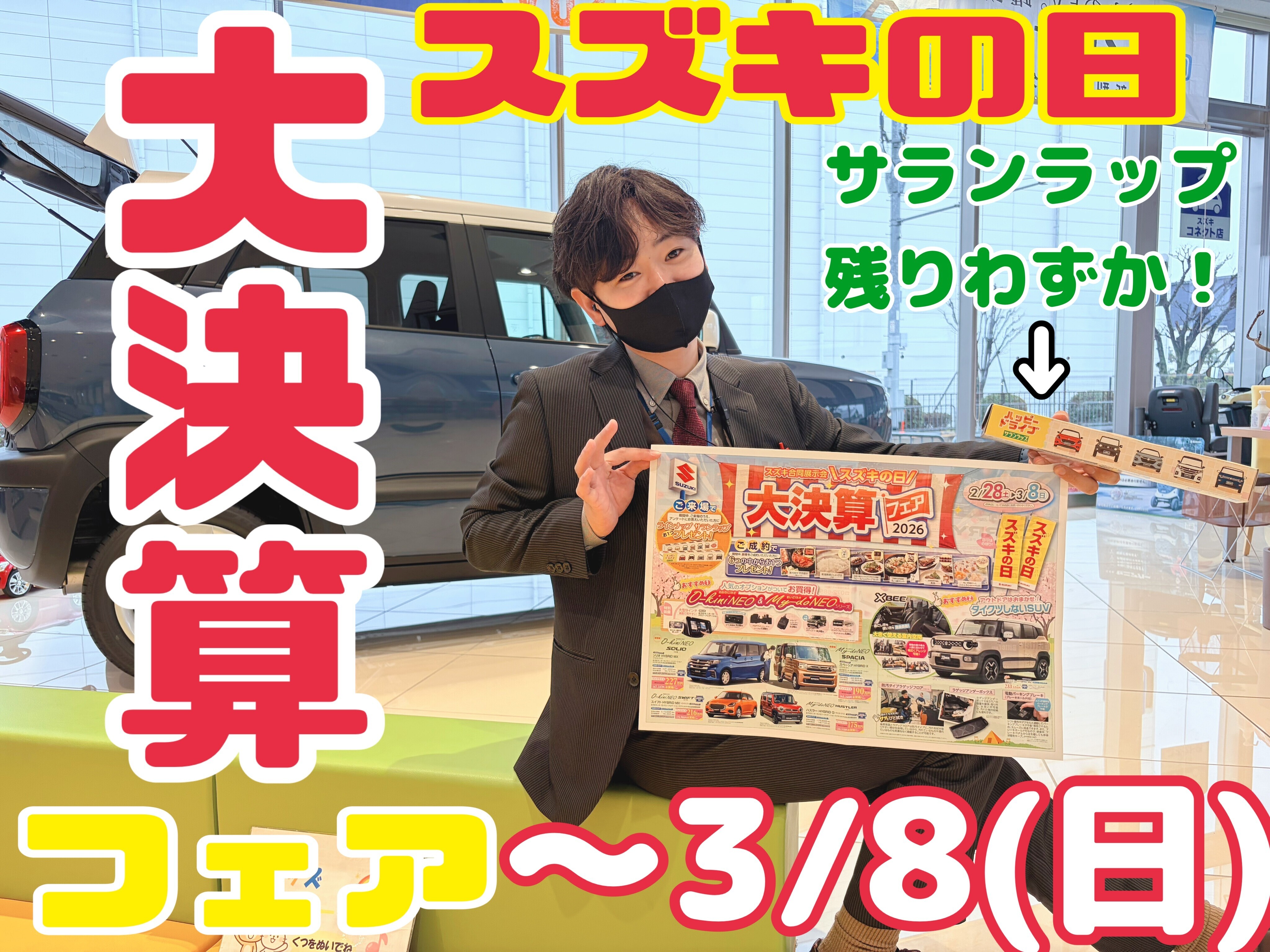 イベント/キャンペーン 2026.03.03 3月決算盛り盛り盛りだくさん!!! キャンペーン期間:2026.02.28~2026.03.08 大決算フェア + スズキの日 3月8日(日)まで!! スーパーお得な キャンペーンが 盛りだくさん!! お得な ワンプライス車!! かえるプラン2.9%!!(一部車種) などなど たくさんご用意しております。 是非ご来店下さい!! 宜しくお願い致します!!