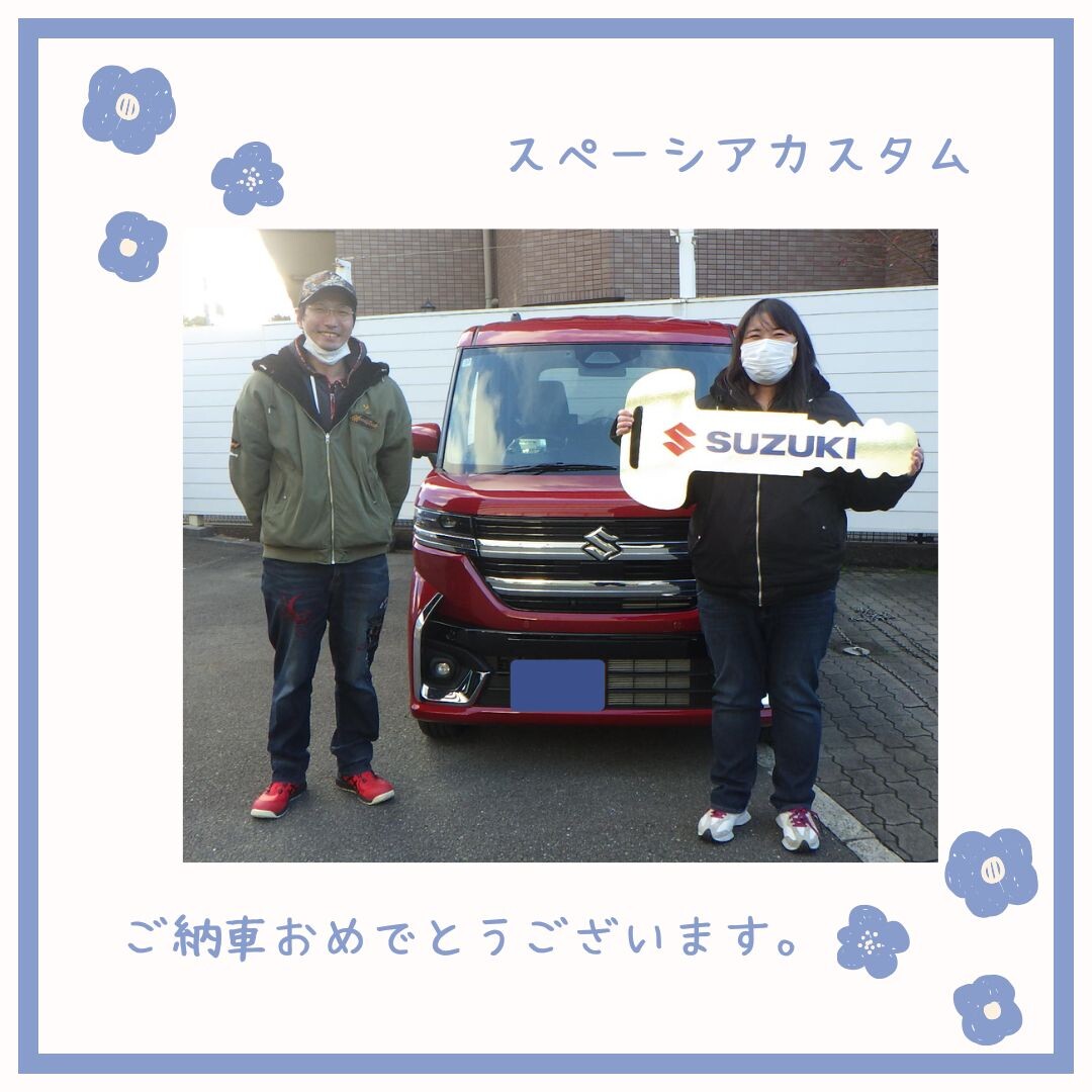 納車ギャラリー 2026.01.27 真っ赤なスペーシアカスタムご納車です♪ 愛車 スペーシア カスタム お客様 Y様 グレード カスタム HYBRID XS ボディーカラー フェニックスレッドパール Y様、ありがとうございます!! 真っ赤なスペーシアカスタムご納車させていただきました! 仲良しご夫婦のY様♪ スタイリッシュで装備充実のスペーシアカスタム! これからも、快適で楽しいカーライフをお過ごしください。 そして、これからも末永いお付き合いよろしくお願い致します。