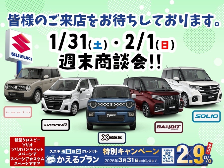 イベント/キャンペーン 2026.01.27 週末商談会します! 皆様こんにちは! いつもホームページをご覧いただき、誠にありがとうございます。 1月最後、2月最初の週末は、 週末商談会実施いたします! 是非週末は、スズキアリーナ茨木へお越しください!! ワンプライス車 残価設定ローン特別金利キャンペーン などなど お得な情報が盛りだくさんのこの機会 少しでも気になる方は、 是非スズキアリーナ茨木へご来店ください! 皆様のご来店、心よりお待ちしております。