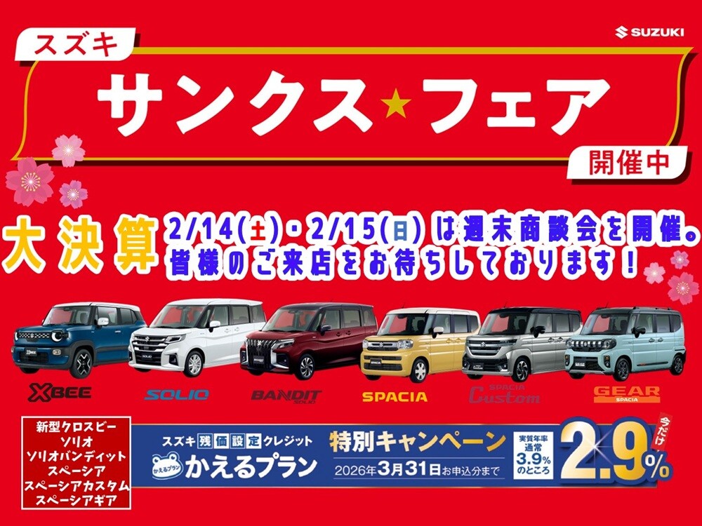 イベント/キャンペーン 2026.02.10 サンクスフェア開催中! ホームページをご覧いただきありがとうございます! スズキアリーナ寝屋川店です! 週末は雪が降ったり選挙があったり盛りだくさんでしたね! 今日は少し暖かくなって過ごしやすかった気がします! ところで!2月も半ばに差し掛かるところですが、 決算期間ということでイベントを開催しております! この機会に是非ご来店ください!! 皆様のお越しをお待ちしております!!!!