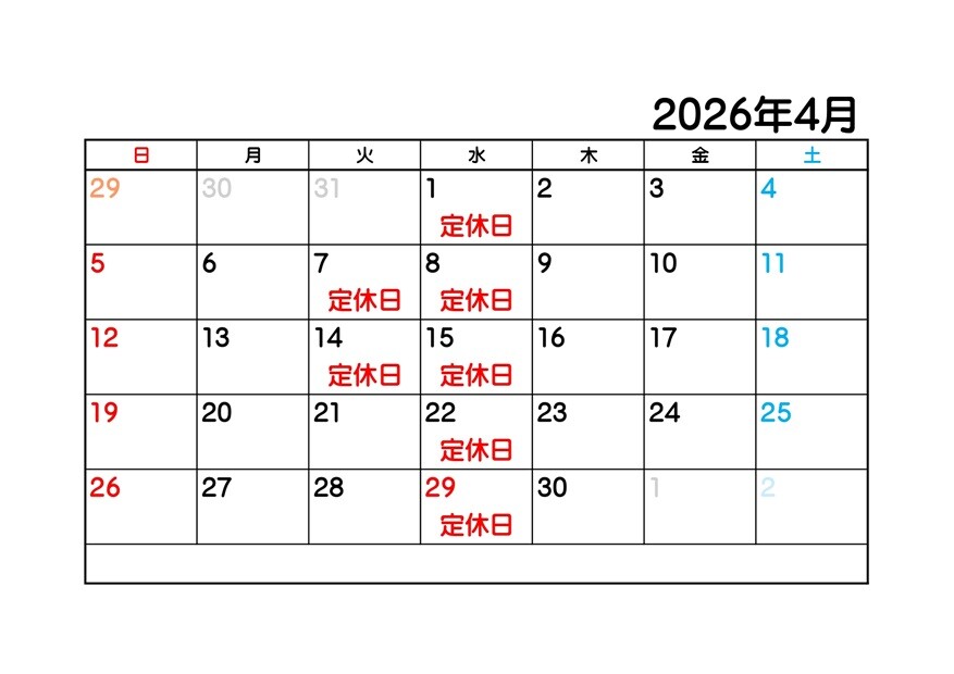 第一・第二 火曜日・毎週水曜日が定休日になります。