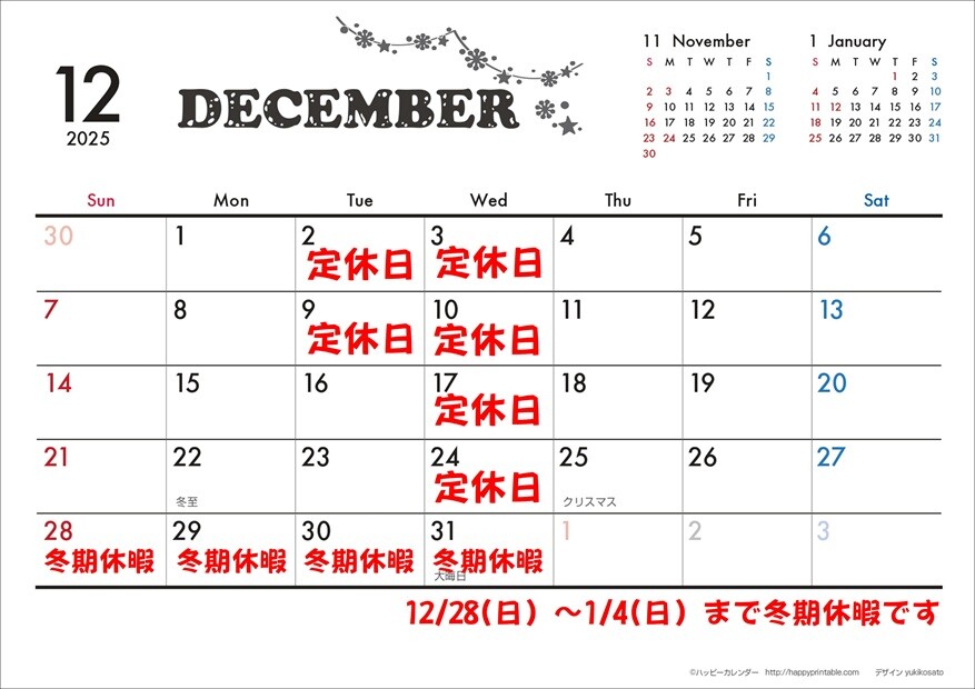 12月28日~1月4日まで冬期休暇となります。