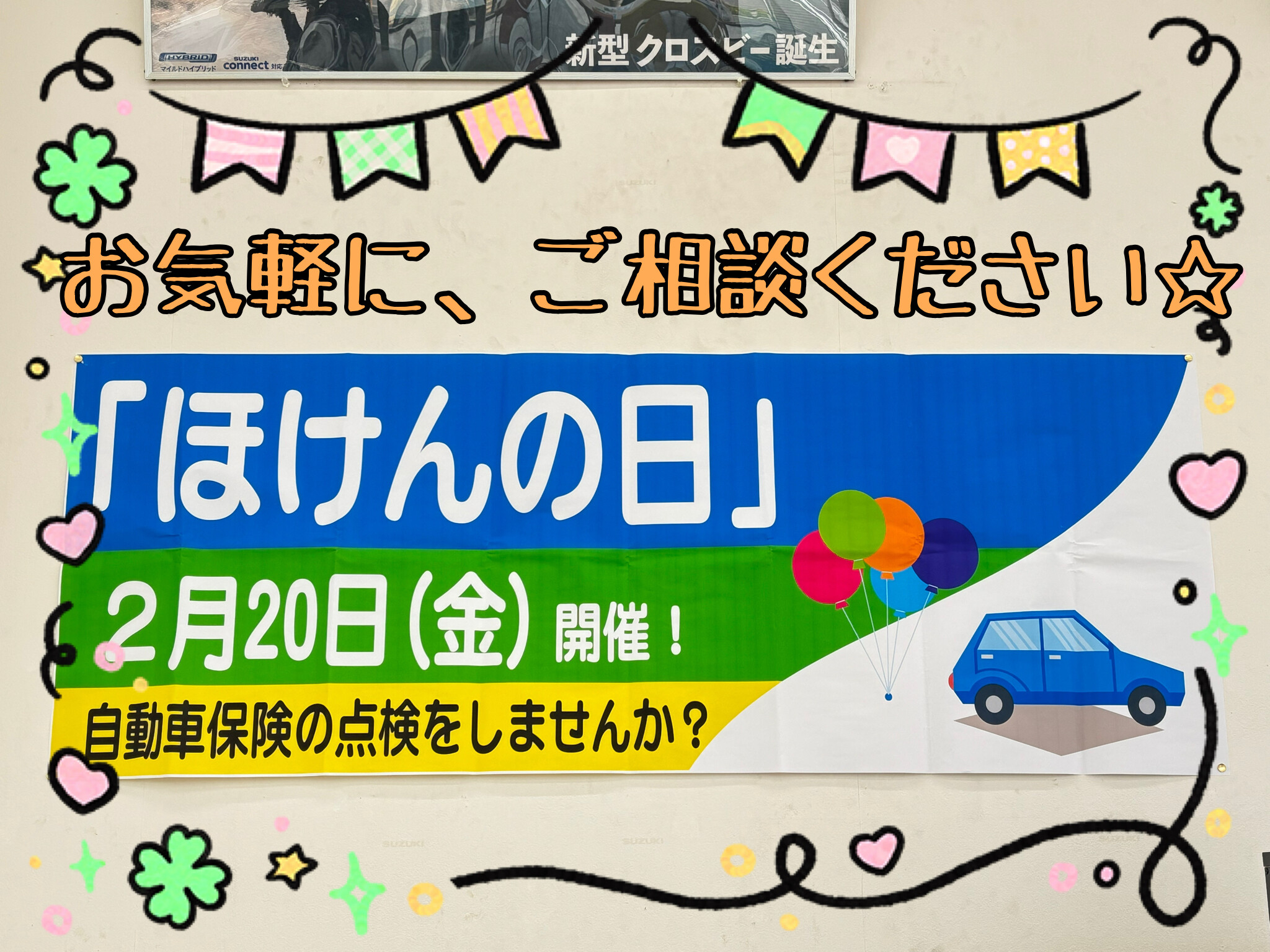 イベント/キャンペーン 2026.02.16 ほ、ほ、ほ、、? ※このイベントは終了しました いつもスズキアリーナ神戸上沢店の ブログをご覧いただき、 誠にありがとうございます 2月20日(金)は ほ、ほ、ほ、、 「ほけんの日」 今ご加入中の自動車保険の 無料点検会を実施いたします ↑↑↑ 保険マスター! 頼りになるうえにしマネージャーも登場 「毎年同じ条件で更新している」 「内容は確認せず、担当者に任せきり」 というお客様はとても多いです スズキ以外の代理店や、 インターネットの保険で加入中の方 大歓迎です みなさまのご来店、 スタッフ一同お待ちしております 今回のオフショットは いたって普通でした