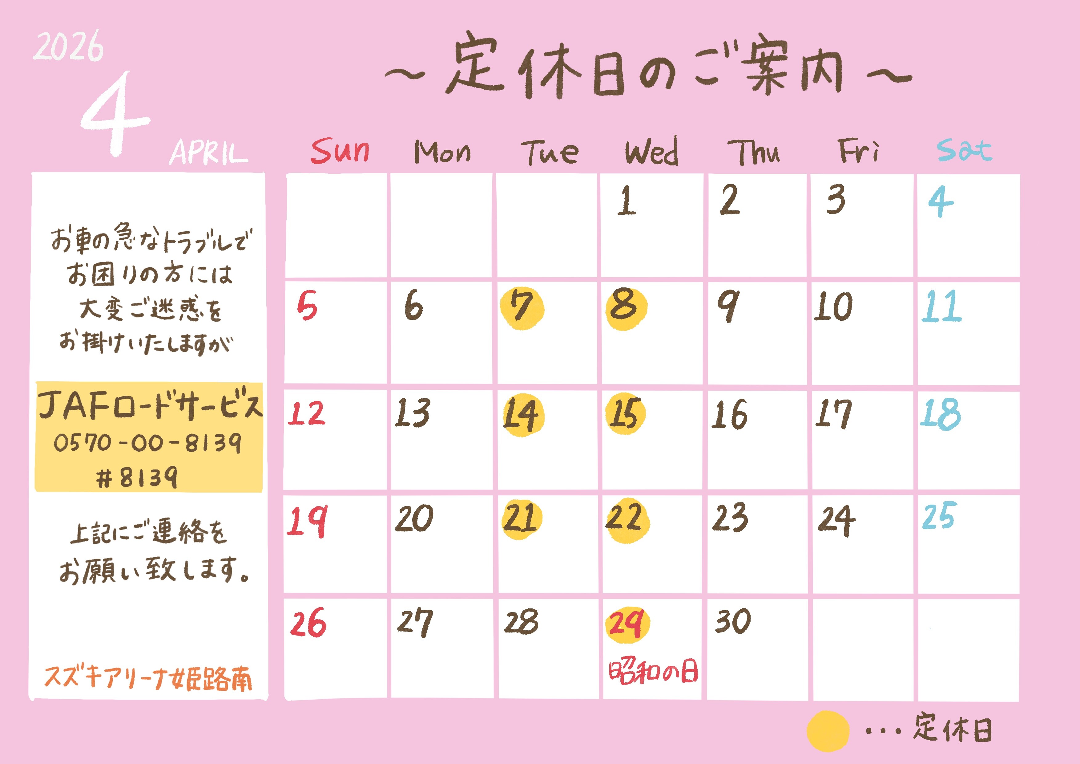 その他 2026.04.01 ~4月定休日のご案内~ 定休日を変更して 営業しております。 本日営業しておりますが 社内研修のため 営業時間 10:00~16:00 となります。 お客様にはご迷惑お掛け致しますが ご理解の程お願いいたします。
