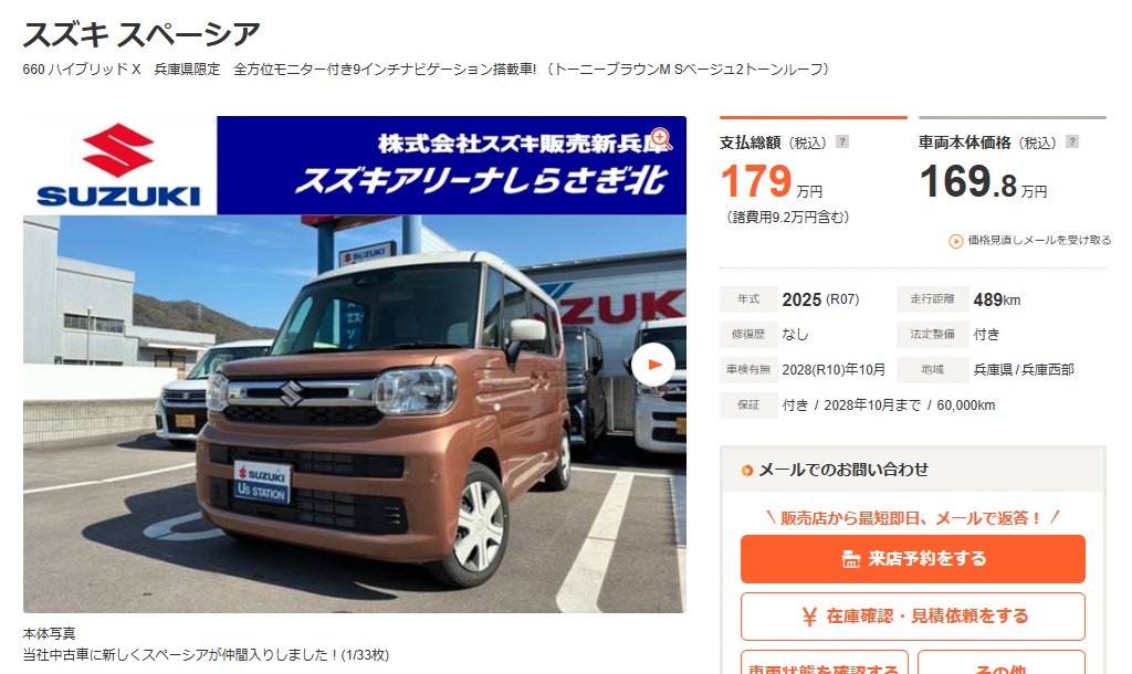 その他 2026.03.20 中古車スペーシア仲間入り 皆様こんにちは♪ しらさぎ北店のブログをご覧いただき 誠にありがとうございます♡ スペーシアが 中古車として入ってきました!! 全方位モニター9インチナビ付 カーセンサー しらさぎ北 気になる方はお早めに 週末のご来店 スタッフ一同お待ちしてます♡ しらさぎ北 079-222-3006