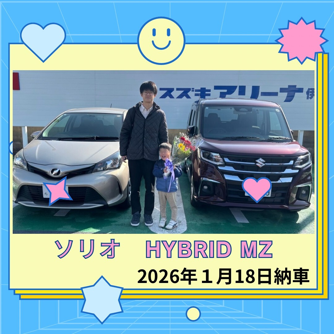 納車ギャラリー 2026.02.02 家族でもらくらくソリオ納車しました!! 愛車 ソリオ お客様 M様 グレード HYBRID MZ ボディーカラー メロウディープレッドパールメタリック この度ソリオ納車しました 今まで家族4人でヴィッツを使用してましたが、 後席スライドドアのソリオにお乗り換えいただきました 色とグレードは最後まで悩まれましたが 一番最上位グレードのMZにされました やはり両側電動スライドドアは便利です これからは家族でいろいろ旅行行ったり 思い出をたくさん作ってください これからも末永く宜しくお願い致します