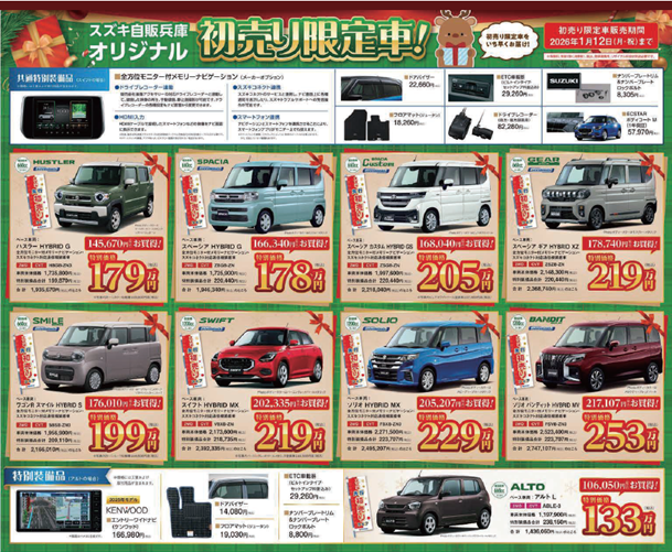 イベント/キャンペーン 2025.12.12 【クリスマスフェア開催中】 キャンペーン期間:2025.12.12~2025.12.14 皆さま こんにちは! アリーナ和田山店です♪ 今年も残りわずかになりましたね スズキでは先行初売り開催中です! 今週は クリスマスフェア~ 年始はゆっくり過ごしたいという方 必見です!! ちなみに 限定車もご用意しております もちろん、 特典も大盤振る舞いです 皆さまのご来店お待ちしております!