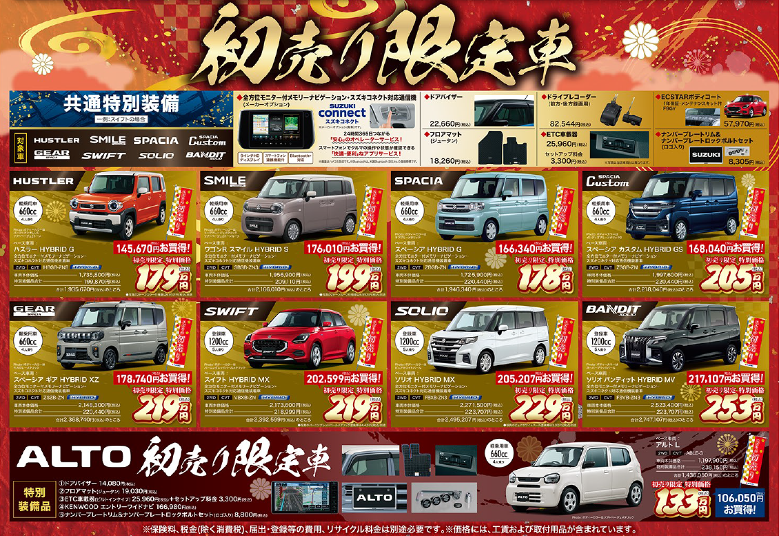 イベント/キャンペーン 2026.01.08 初売り!残りあと5日! いつもお世話になります スズキアリーナ淡路店です 現在、開催中の スズキの初売り 開催期間は1月12日(月)までです ※残りあと5日のみ!! 新車ご検討中の方、お急ぎください 「初売り」、かなりお得な特典多数です 残価設定クレジット「かえるプラン」 クロスビー・ソリオ・バンディット・スペーシア・カスタム・ギア 特別金利キャンペーン中!! 今がチャンスです!! ご来店お待ちしております