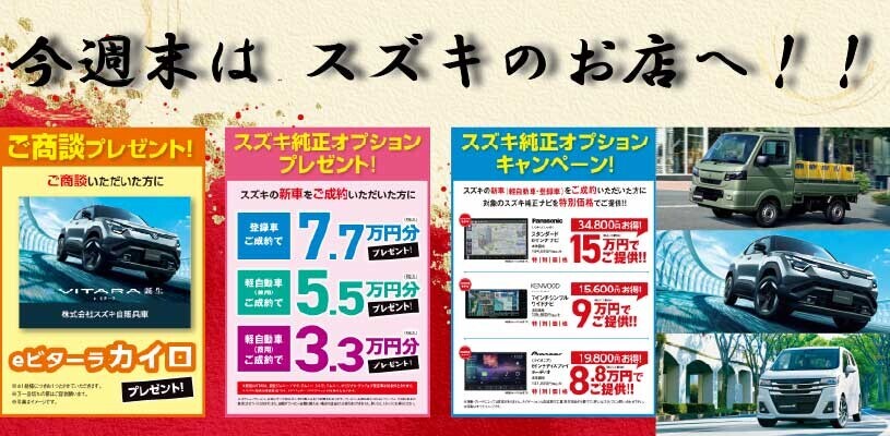 イベント/キャンペーン 2026.01.29 1月最後の週末! いつもお世話になります スズキアリーナ淡路店です 1月最後の週末です ご来店お待ちしております ソリオ・クロスビー・スペーシア ご検討の方は 残価設定クレジット「かえるプラン」が おススメですよ