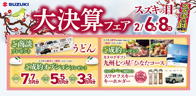イベント/キャンペーン 2026.02.05 大決算フェア!! いよいよ決算が始まります! 2月6日(金)・7日(土)・8日(日)は、 大決算フェアを開催します ぜひご来店ください。 ご商談プレゼントもご準備しています。