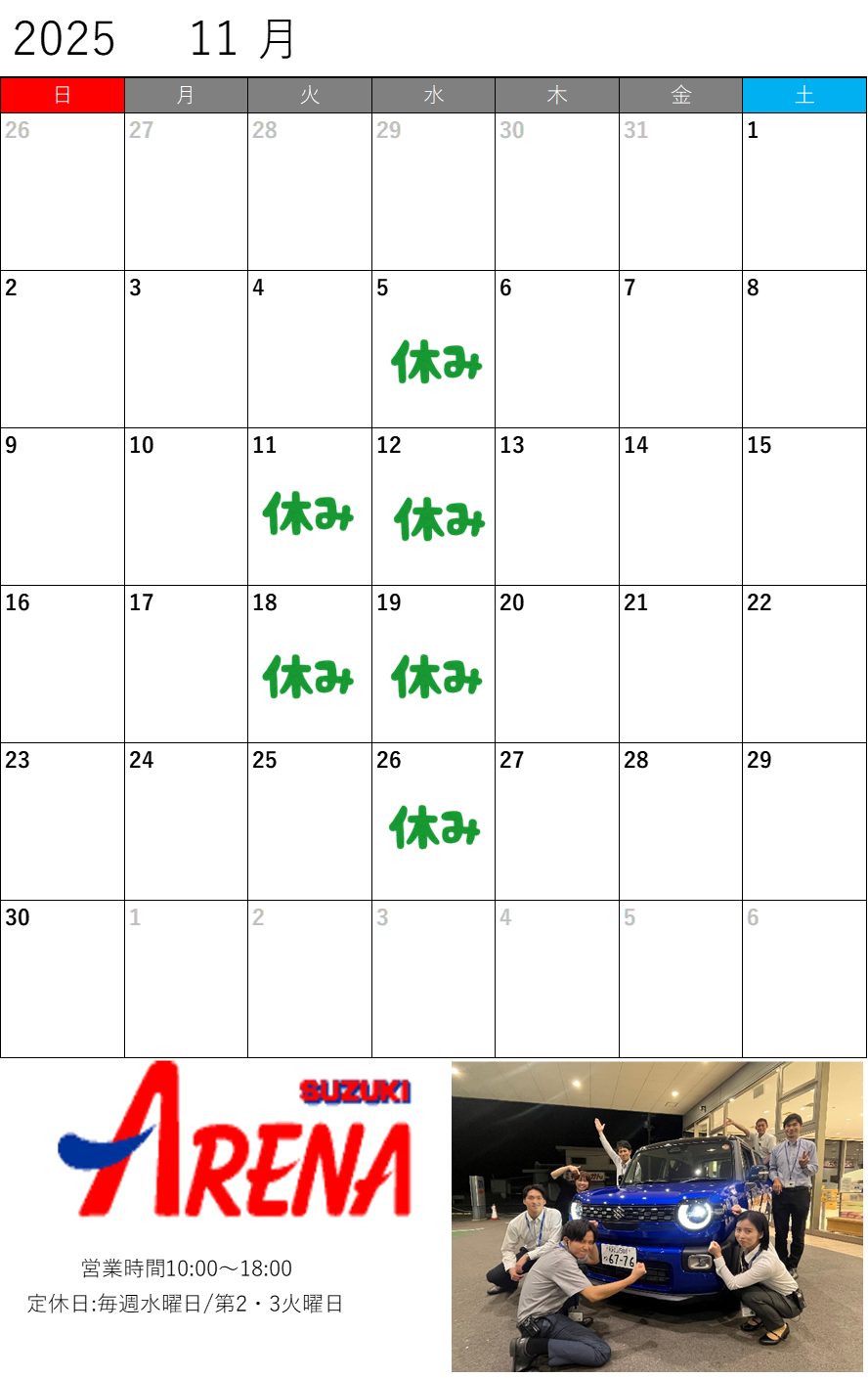 イベント/キャンペーン 2025.10.22 10月最後の展示会!!!10/25-27 キャンペーン期間:2025.10.25~2025.10.27 おはようございます! アリーナ有田店の松林です 最近は朝と夜が一気に涼しくなりましたね! 季節の変わり目ですので体調には十分に お気を付けください! 10月ももうすぐ終わりますが やります! 週末展示会 開催期間 10月25日、26日、27日 新型クロスビーや人気のスペーシア、ハスラーの 試乗車ご用意してお待ちしております! 11月の営業カレンダーです! みなさまのご来店お待ちしております ※当店はご予約優先制となっております。 ご来店の際にはあらかじめご予約頂けますようお願い致します。