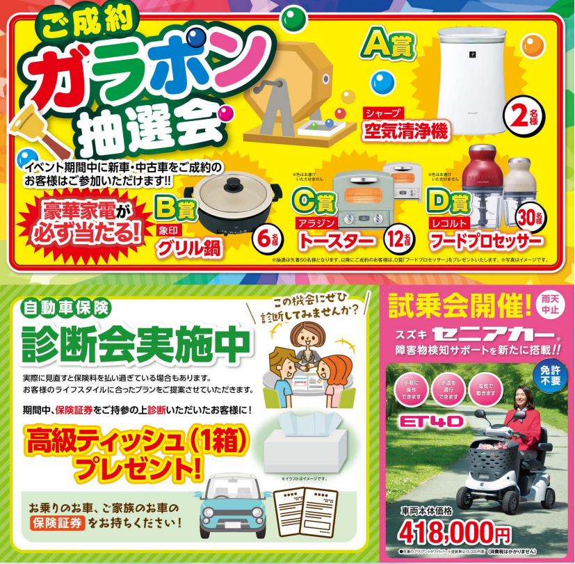 イベント/キャンペーン 2026.04.23 ★黒田店15周年感謝祭のご案内★ ※このイベントは終了しました いつもスズキアリーナ黒田店を ご愛顧いただきありがとうございます スズキアリーナ黒田店は みなさまのおかげさまで15年目に突入しました 日頃のご愛顧に感謝いたしまして、 4月25日(土)・26日(日) の2日間、感謝祭を開催いたします ※イベント時間は両日とも16時まで※ 2日間限りの盛りだくさんの内容となっております 心をこめておもてなしいたします 皆様のご来店をスタッフ一同心よりお待ちしております。