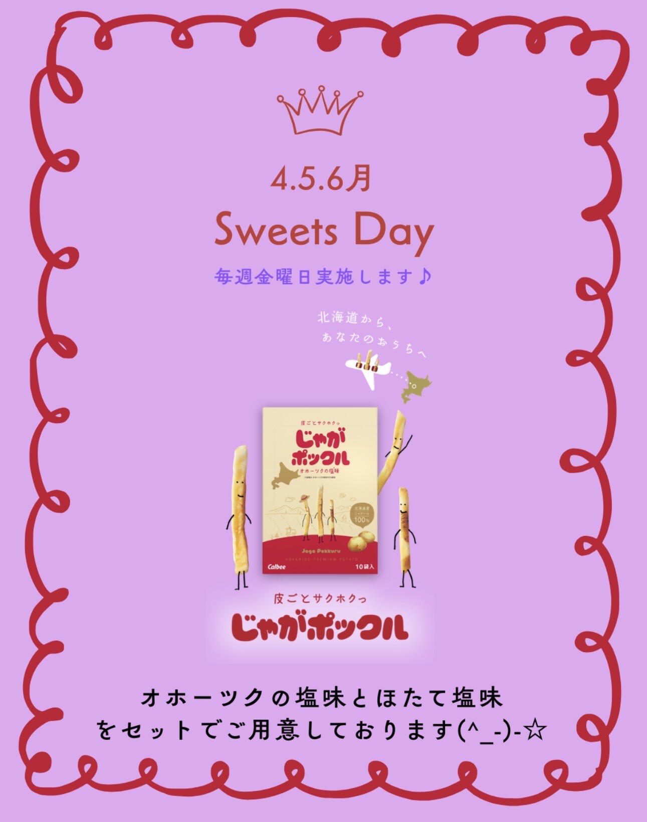 その他 2026.03.30 スイーツデーのお知らせ! 皆様こんにちは いつも当店のブログをご覧いただき ありがとうございます! 4・5・6月のスイーツデーのお知らせです 小学生の頃に友達にもらって初めて じゃがポックルを食べたあの衝撃は 忘れられません!!!! とにかく美味しすぎます!!!!笑 今回は、定番のオホーツクの塩味と ほたて塩味を2種セットにしてご用意しております スイーツデーは毎週金曜日です 金曜日のご予約お待ちしております⭐︎