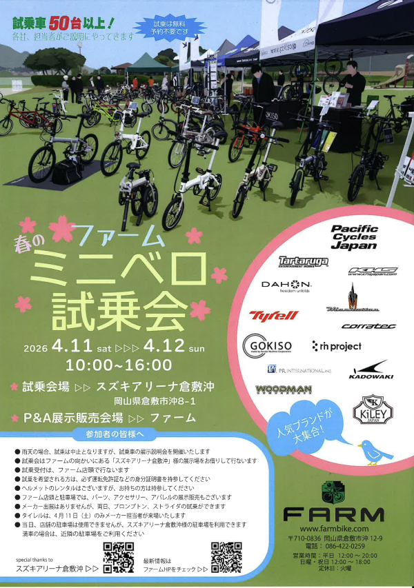 イベント/キャンペーン 2026.03.18 ミニベロ試乗会 IN アリーナ倉敷沖 みなさんこんにちわ この度もアリーナ倉敷沖のブログを ご覧いただきありがとうございます 川辺の桜もあちこちで咲き始め 春の気配を感じる今日この頃ですが いかがお過ごしでしょうか? さて 突然ですが皆様 ミニベロって ご存じですか❓ フランス語で自転車を ベロ(Velo)と言うので 小さい自転車の事を ミニベロと呼ぶそうです 雰囲気は上の写真の様な自転車です どうです かわいいでしょう ちょっとしたお買い物や お散歩がてらのサイクリングに ちょうどよいと思います しかも今回お見せしたミニベロは なんと折りたたみ式 こんなにコンパクトになるんです スペーシアに乗せても この余裕です みなさんいかがですか お車に自転車を積んで 日頃馴染みのない場所を ツーリングしに行くのも 楽しいと思いませんか もしミニベロに興味を持たれた方に 朗報 です ちょっと先の事になりますが アリーナ倉敷沖の向かい側にある ファーム(FARM)さんが ミニベロ試乗会を 開催されます 日時は2026年 4月11日(土)・12日(日) 10:00~16:00(両日) となっております 試乗車50台以上 各社 担当者さんも説明に来てくれます 試乗は無料 予約も不要です 試乗会の会場は アリーナ倉敷沖の展示場 で実施します (受け付けはファーム店頭で実施します) 詳しくはファームさんの ホームページを ご覧ください 春先の楽しいイベントになると思います ご興味のある方はぜひお越しください なお スズキアリーナ倉敷沖 におきましてもスズキ車の 展示車・試乗車・中古車 取り揃えてございます よろしければミニベロとコラボで ぜひご検討ください スタッフ一同ご来場を 心よりお待ちしております スズキアリーナ倉敷沖