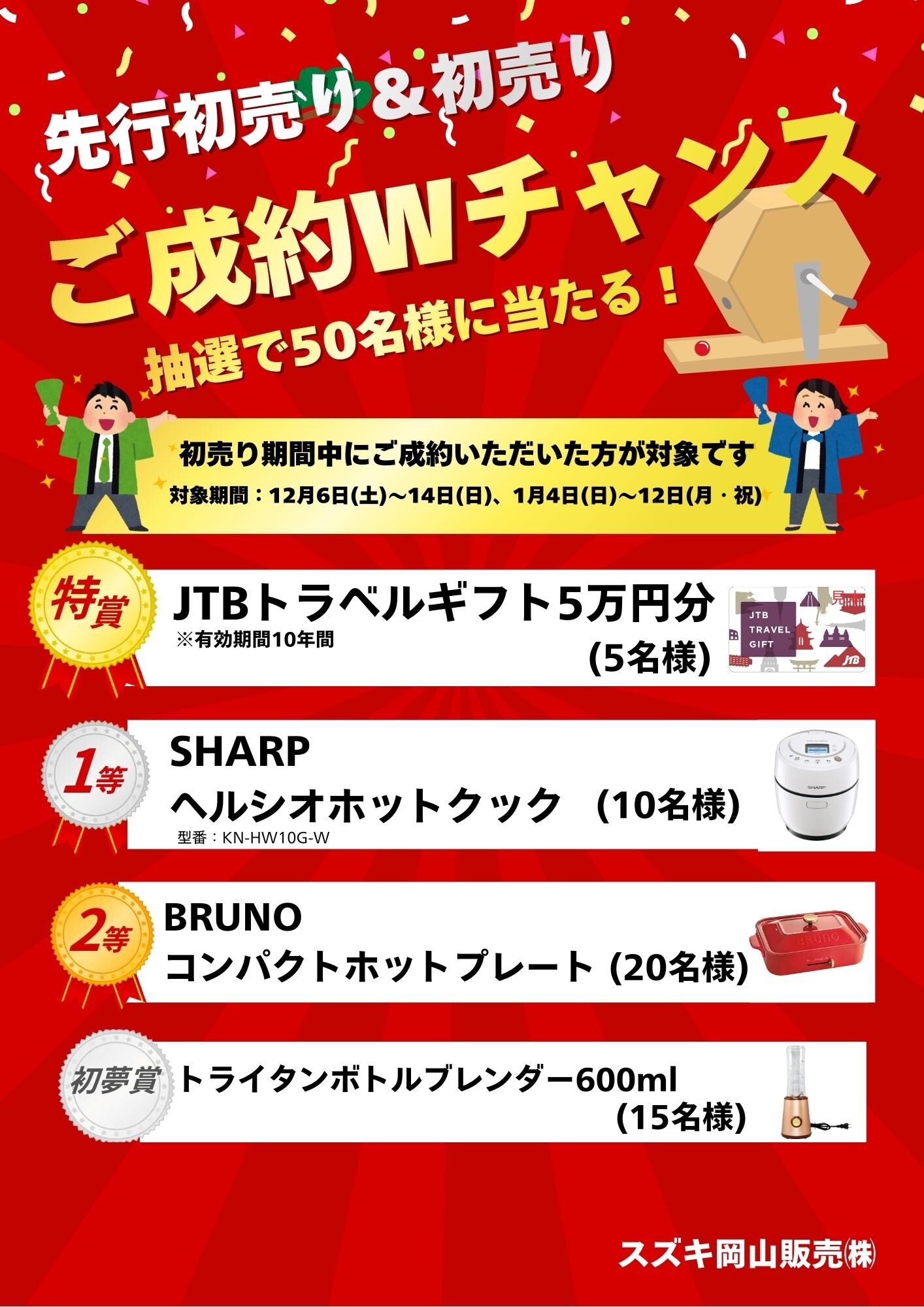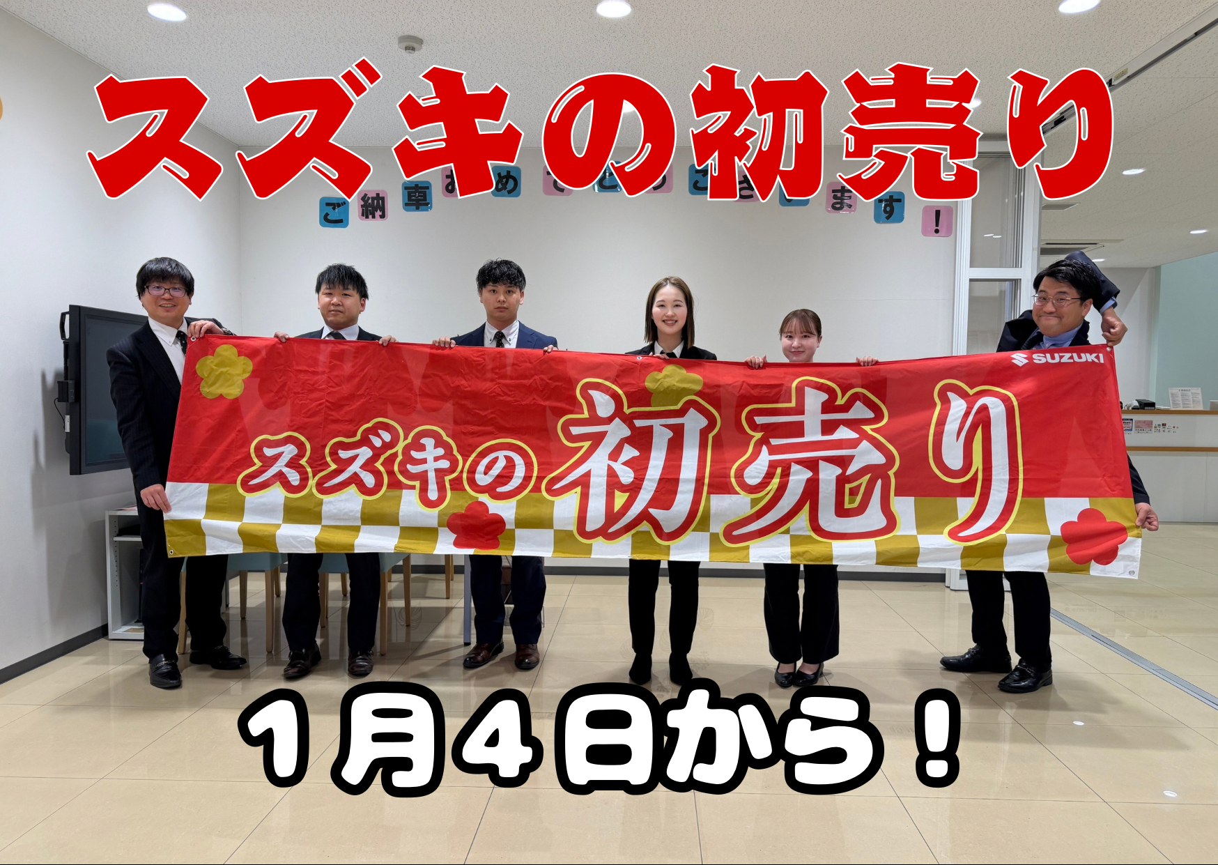 イベント/キャンペーン 2025.12.26 ☆スズキの初売り1月4日から!☆ キャンペーン期間:2026.01.04~2026.01.12 こんにちは いつも倉敷中島店のブログをご覧いただき ありがとうございます さて1月4日から!!! 「 スズキの初売り 」 開催します 期間中ご来場いただいた方に! 干支ティッシュプレゼント また期間中ご商談いただいた方には! 福バックをプレゼントいたします また期間中ご成約いただいた方には 軽自動車:30,000円 小型車:50,000円 純正オプションプレゼント! また選べる鍋セットプレゼント! さらに 新車ワンプライス車もございます W抽選会も開催中 人気の軽・小型車の展示車・試乗車 ございます ぜひこのお得な機会にご来店ください! ↓ 詳しくは下の画像をクリック! 皆様のお越しを スタッフ一同お待ちしております
