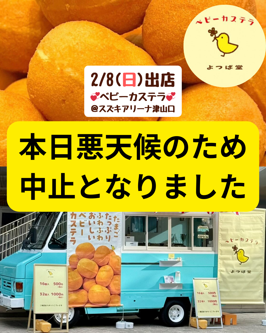 その他 2026.02.08 【開催中止のお知らせ】本日よつば堂キッチンカー雪のため中止となりました。 皆さまこんにちは! スズキアリーナ津山口です 本日出店予定でした よつば堂ベビーカステラのキッチンカーは 雪のため出店中止となりました 楽しみにしてくださった皆さま、 大変申し訳ございません。 次回の出店を楽しみにお待ちいただけますと 幸いです。 本日は大雪で道路状況の悪いところが多いので 皆さまお気をつけてお過ごしくださいませ。 運転の際は安全運転でご移動ください スズキアリーナ津山口