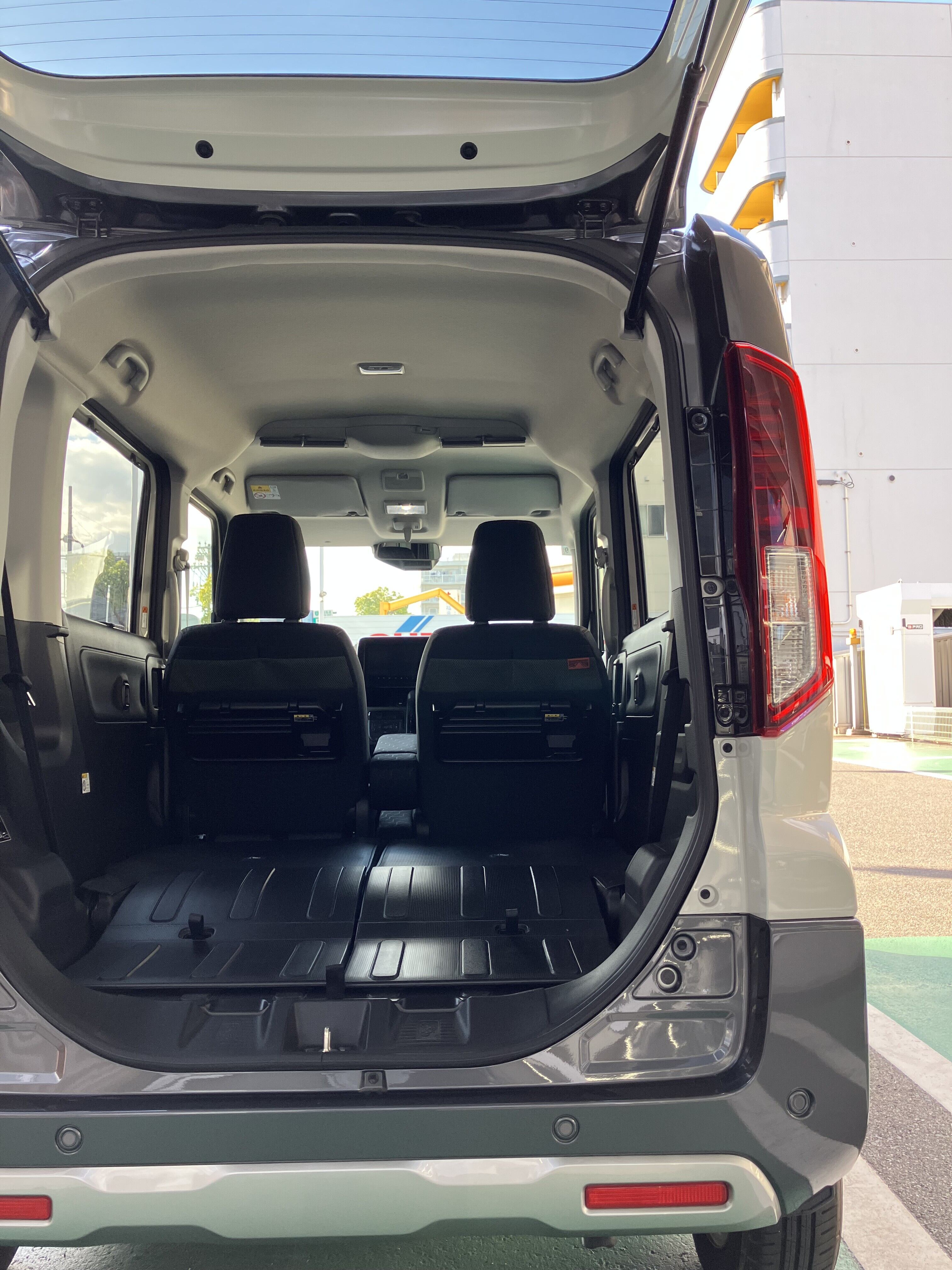 後席を倒すと専用のラゲッジフロアが登場!通常のスペーシアのシートと異なり汚れに強い加工が施されているので、アウトドア用品やロードバイクの汚れを気にせず積み込むことができます!