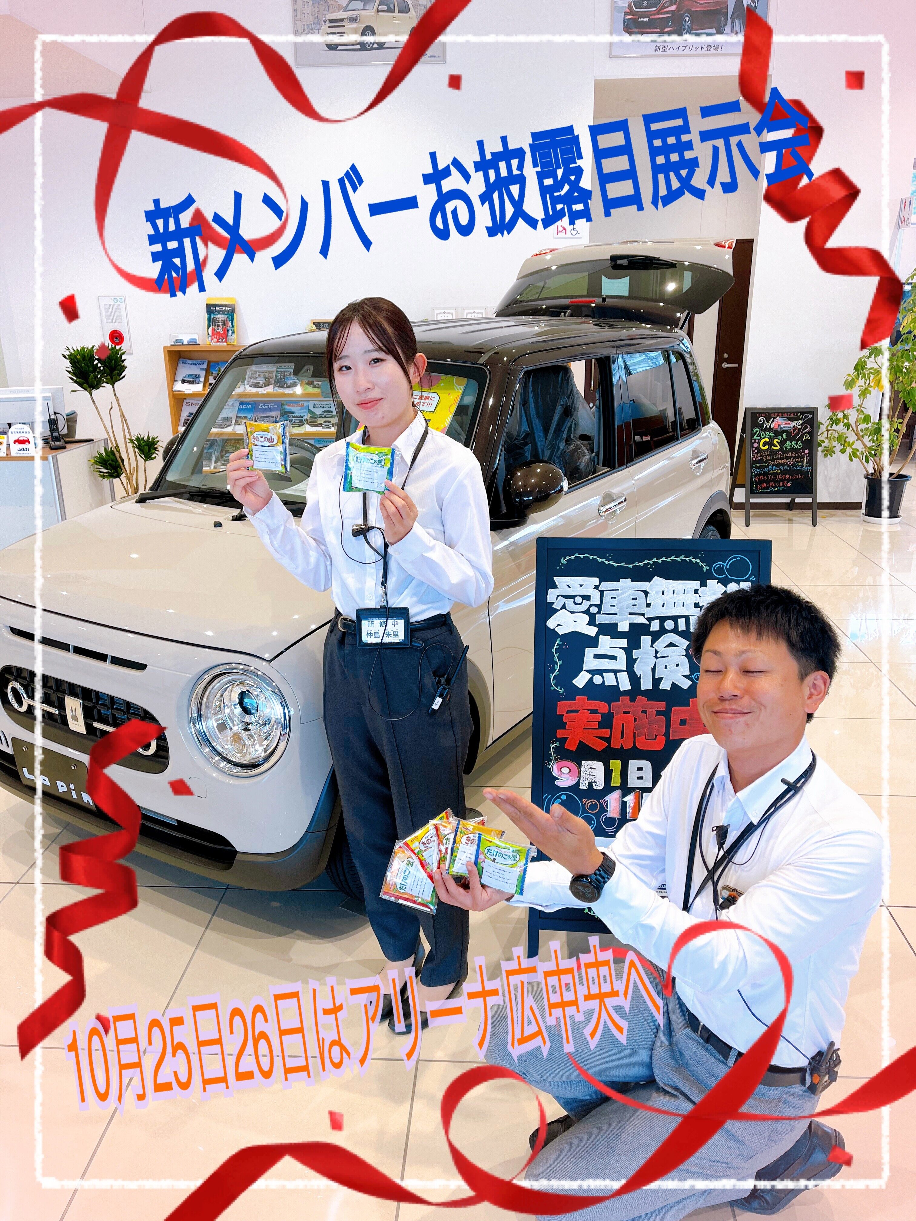 イベント/キャンペーン 2025.10.23 ☆新メンバーお披露目展示会 第一章☆ いつもスズキアリーナ広中央のホームページをご覧いただきありがとうございます 季節の変わり目は風邪をひかないように気を付けてくださいね さて! アリーナ広中央店では 10/25(土)より新メンバーお披露目展示会を開催いたします ご来店の際は是非暖かくお声かけください。 本人たっての希望で大好きなお菓子 きのこの山orたけのこの里をプレゼントいたします(数に限りあり) その他お得情報も盛りだくさん。皆様のご来店お待ちしております インスタも要チェック