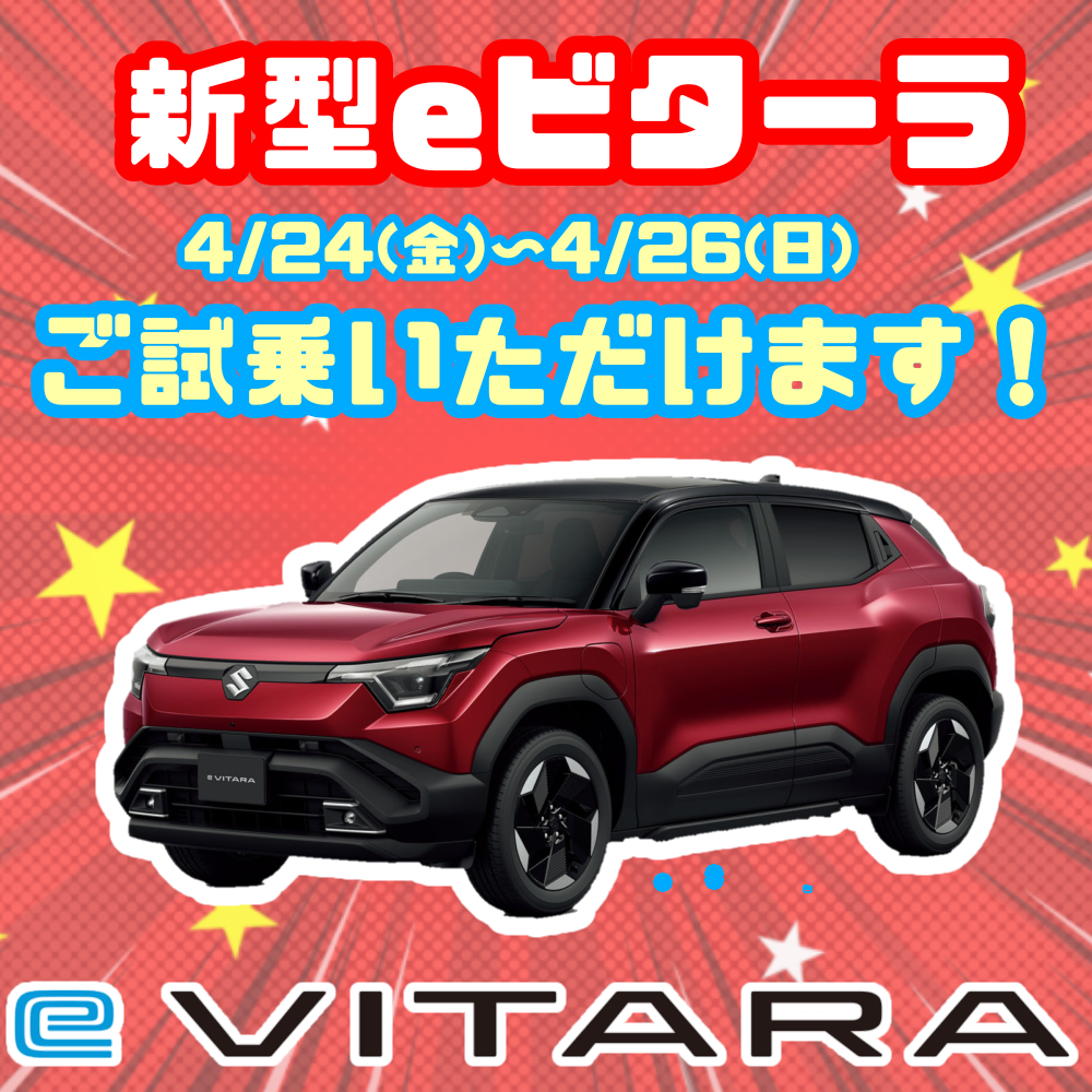 イベント/キャンペーン 2026.04.20 ★24日~26日 eビターラ試乗会開催★ ※このイベントは終了しました いつもアリーナ西条のホームページをご覧いただきありがとうございます! 4月24日(金)~26日(日) eビターラ試乗会 を開催いたします アリーナ西条で電気自動車にご試乗いただけるチャンスです EVの「静粛性」「圧倒的な加速」を 是非体感してください 試乗予約はこちら ⇒ または 082-423-7021 まで みなさまのご来店お待ちしております