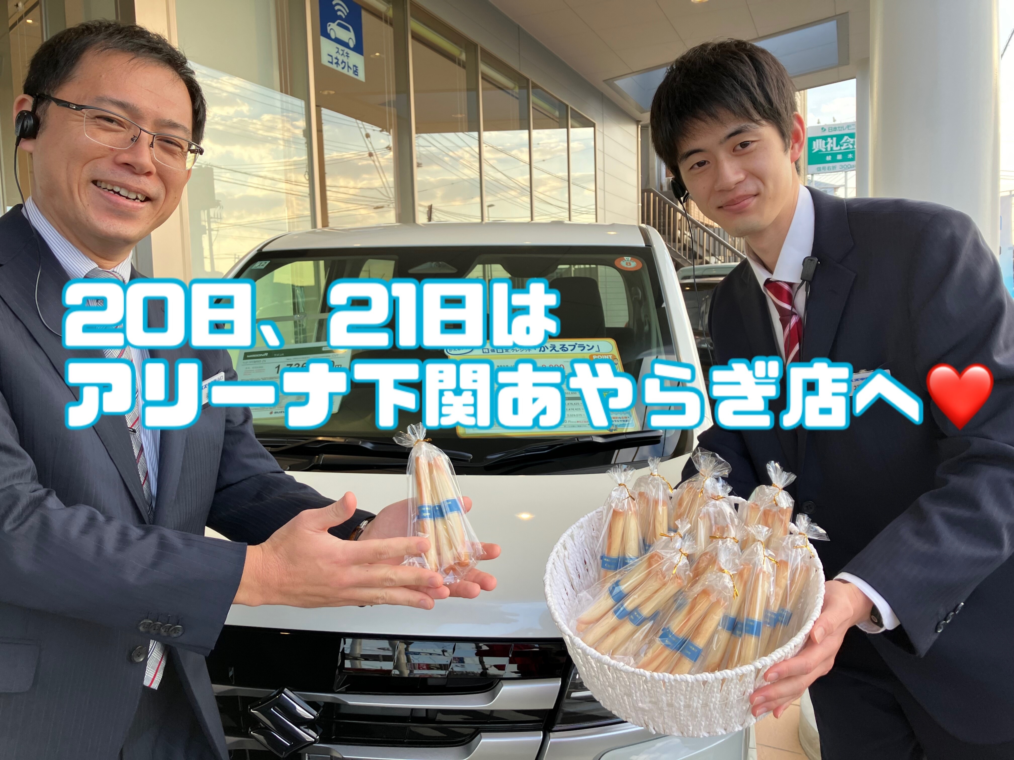 その他 2025.12.20 あやらぎ店からのお知らせ☆彡 おはようございます! アリーナ下関あやらぎです 当店では20日(土)、21日(日)と 試乗もしくは査定させて頂いたお客様に ヨックモックのシガール3本セットをプレゼント 新型ワゴンRもございます 皆様のご来店をスタッフ一同、 お待ちしております