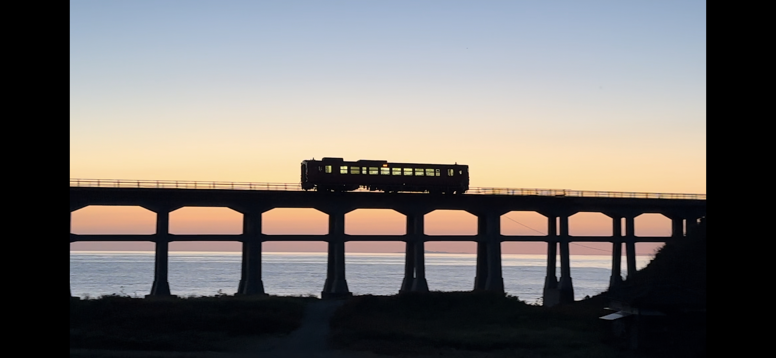 海岸線に沈む太陽と、紅く染まった海、そして橋を横断する電車が一度に撮影できます!