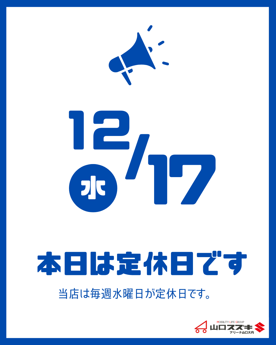 その他 2025.12.17 〇12月17日は定休日です〇 当店は毎週水曜日が定休日のため、12月17日は休業日でございます。お車緊急トラブルの際は、JAFロードサービス(#8139)までご連絡をお願いいたします ご迷惑をおかけいたしますが、ご承知おきいただきますようよろしくお願いいたします また、当店の最新情報やイベント情報、定休日などはインスタグラムでも更新しております! 是非フォローしてチェックしてくださいね!