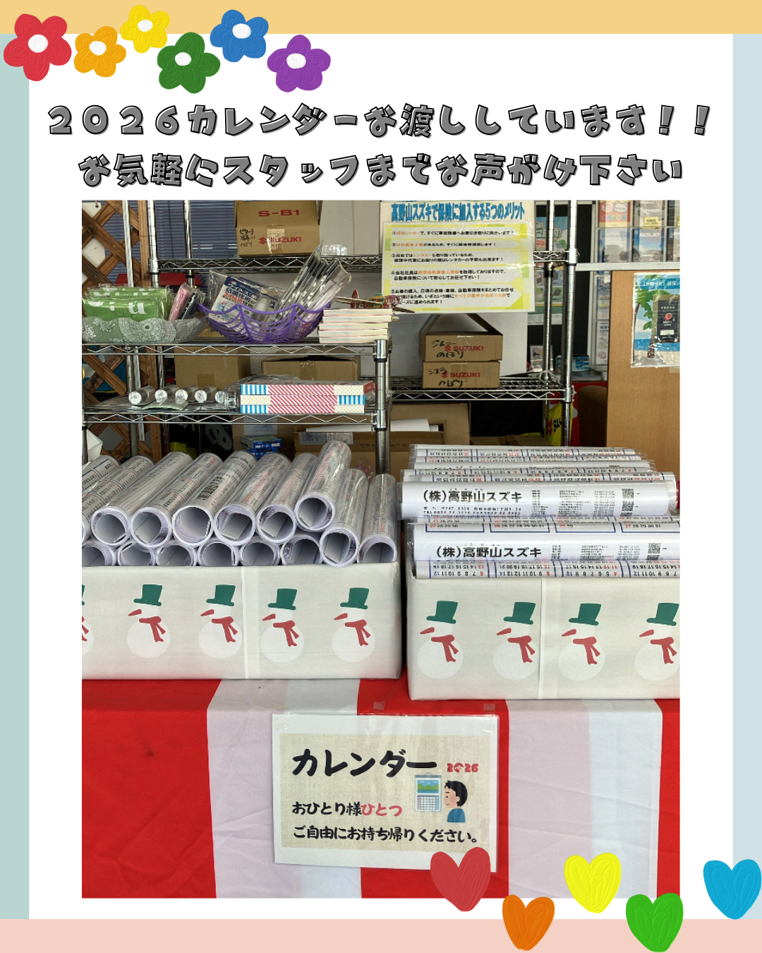 その他 2025.11.23 2026カレンダーのご案内 こんにちは、西部営業所です! 今年もいよいよ年末が近づいてまいりましたね♪ 当営業所では、季節の雰囲気を楽しんで頂けるよう大きなクリスマスツリーを飾りました ショールーム内のあちらこちらにサンタさんがいるので 探してみてください また、2026年版カレンダーの準備が整いましたので ご希望の方はスタッフまでお気軽にお声がけ下さい 今年も残りわずかとなりましたが、引き続きどうぞよろしくお願いいたします。 皆様のご来店心よりお待ちしております。