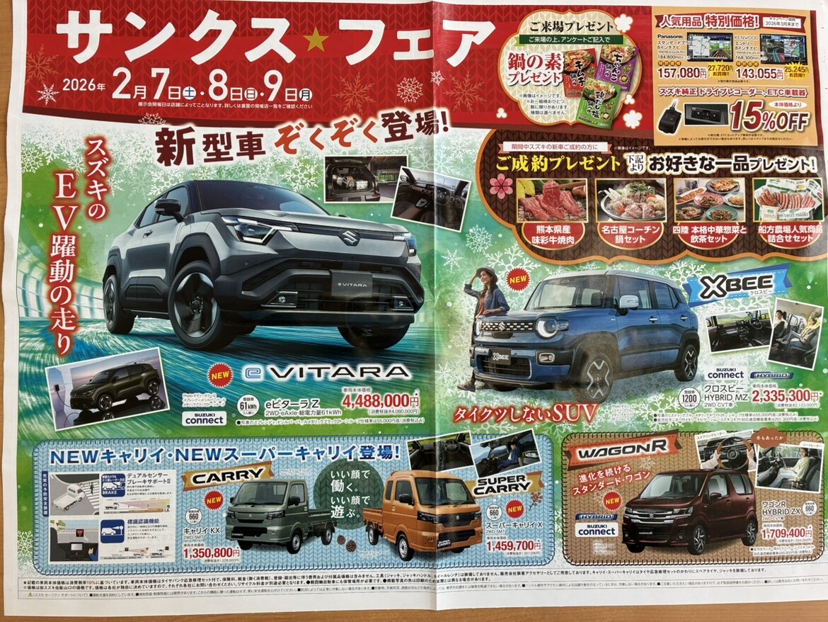 イベントデー 2026.02.05 2月7日~2月9日はサンクスフェアを開催します♪ みなさま、こんにちは。 スズキアリーナ柳井です さて、当店では2月7日から2月9日の間、 ☆サンクスフェアを開催します☆ 焼肉や名古屋コーチンのお鍋、中華、皆大好きな船方農場の人気商品といった 豪華な成約プレゼントもございますので、気になるお車がある方は ぜひお気軽にご来店ください みなさまのご来店、スタッフ一同 お待ちしています!