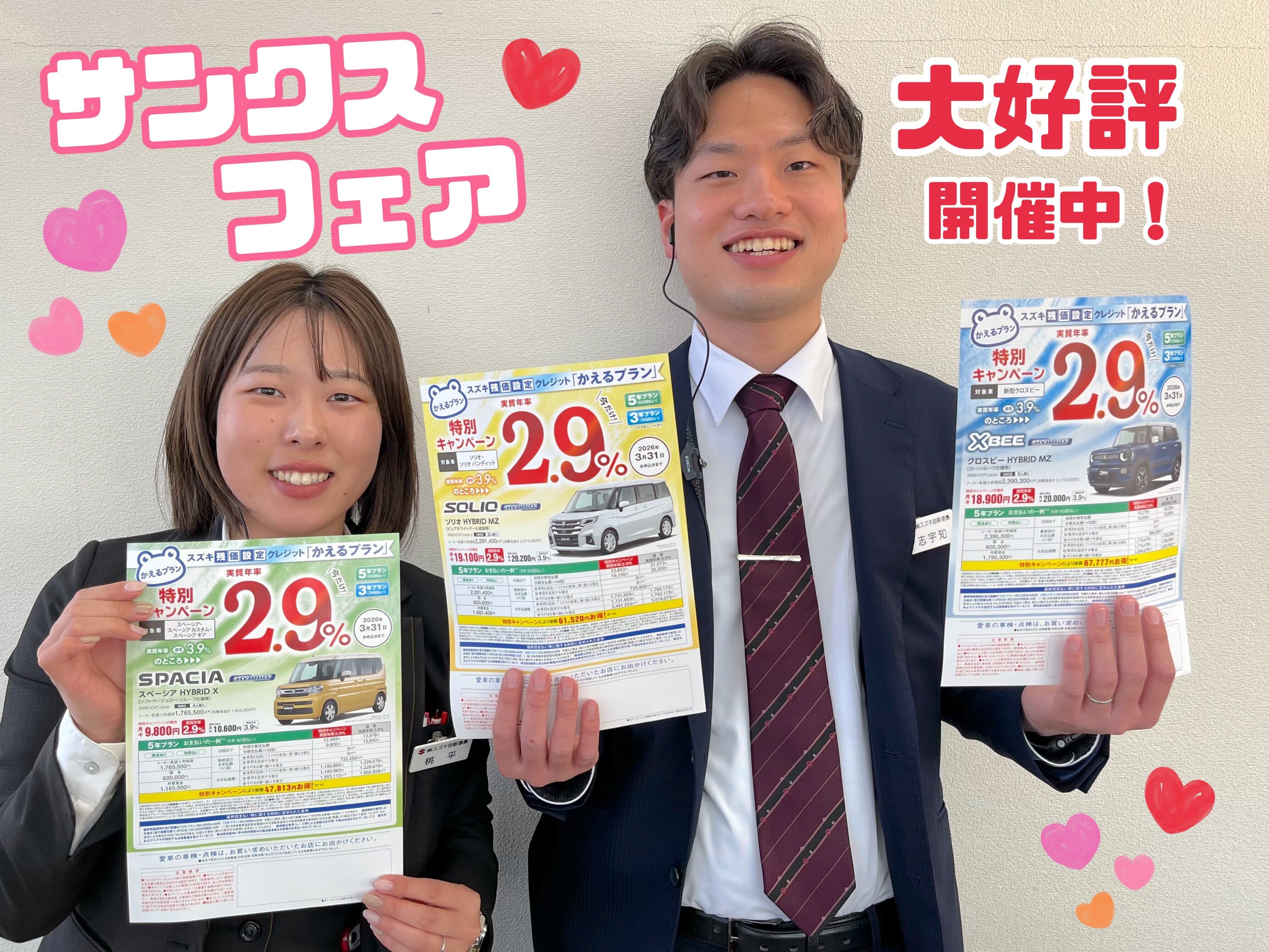 イベント/キャンペーン 2026.02.25 サンクスフェア大好評開催中! サンクスフェア おかげさまで ただいま大好評開催中です 決算時期の現在は、 お車をお得に購入できるチャンスです 引き続きみなさまのご来店 お待ちしております!!