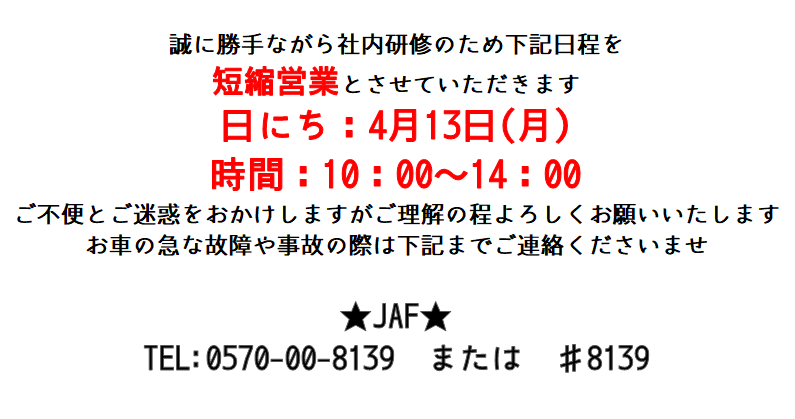 その他 2026.04.10 ◆短縮営業のお知らせ◆ いつもブログをご覧いただき ありがとうございます 事務のすずえです 本日は短縮営業の お知らせです 4月14日(火)、15日(水)は 定休日となっております 16日(木)より 通常通り営業いたします