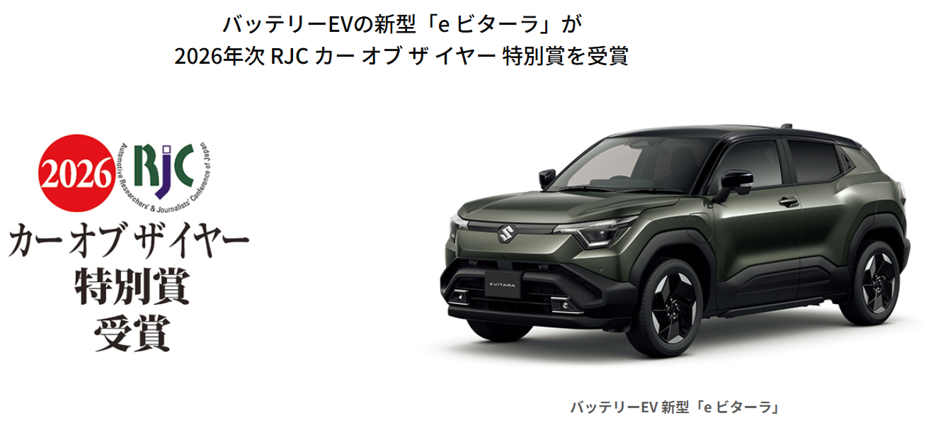 新車情報 2025.11.18 バッテリーEVの新型「eビターラ」が 2026年次 RJC カー オブ ザ イヤー 特別賞を受賞! スズキの バッテリーEV新型「eビターラ」が NPO法人 日本自動車研究者 ジャーナリスト会議 (RJC) が主催する 2026 年次 RJC カー オブ ザ イヤー 特別賞 を受賞しました!! 今回の RJC カー オブ ザイヤー 特別賞の受賞理由は 「アジアを中心とした最新技術を集約 し、インドの最新工場で生産される スズキ初のBEV。 世界100以上の国 と地域へ投入されるグローバルモデル でありながら、日本の多様な道路環境 や降雪地域にも対応できる ボディサイズや4WD仕様を備え、 誰にでも扱いやすいクルマづくりを 実現した点を評価した。」 としています。 また、6ベストに選出された 新型「クロスビー」についても 最終選考会にて高く評価されました!