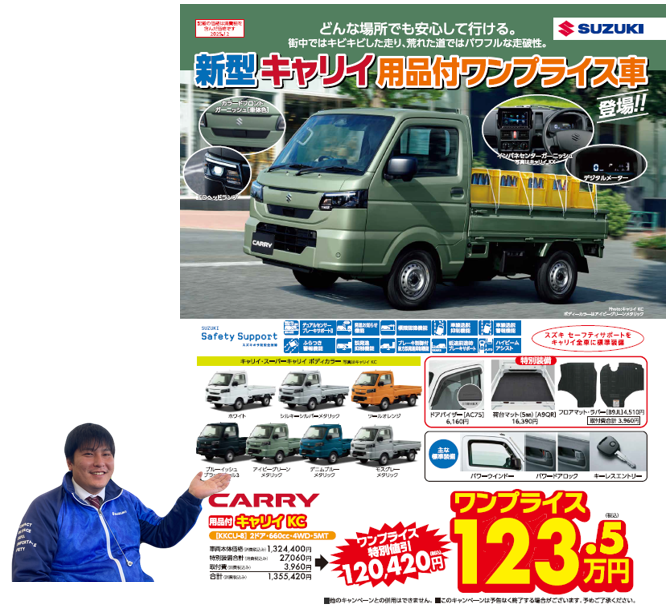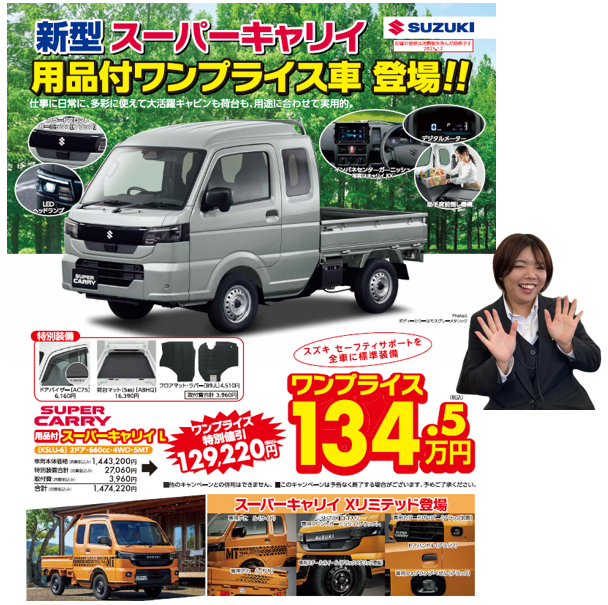 新車情報 2025.12.22 新型キャリイ・スパーキャリイ用品付 ワンプライス車 登場!! 新型キャリィ・スーパーキャリイに 用品付ワンプライス車 登場です!! 特別装備付で どどーーん!!と ワンプライスでご提供 超お得な 用品付ワンプライス車!! ぜひご検討ください クリスマスイベントも 12月25日(木)まで開催中 アリーナ鴨島スタッフ一同 ご来店を心よりお待ちしてます