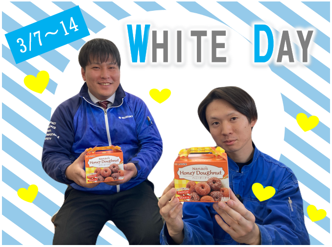イベント/キャンペーン 2026.03.06 【3/7~14限定】ホワイトデーイベント&サンクスフェア開催! 決算本番の熱気が ショールームにも満ち溢れています 先月のバレンタインイベントも ご好評いただきましたが 今月はホワイトデーイベント 開催いたします 期間中にご来店いただいたお客様へ 一組様につき一箱 ドーナツ をプレゼントいたします ドーナツを楽しみながら ぜひチェックしていただきたいのが 現在開催中の サンクスフェア 3月3月末日まで! ご来場特典 心も体もポカポカに! フェア期間中にご来場いただいた 皆さまへ感謝の気持ちを込めて 「うどん」をプレゼントいたします! ※数に限りがございますので、お早めに! ご成約特典 今がチャンス! 豪華「オプションプレゼント」 新車をご成約いただいたお客様には オプションプレゼントをご用意 いたしました! ※一部対象外車種あり ★=★=★=★=★=★=★=★=★=★ ホワイトデーイベント期間 2026年3月7日(土)~14日(土) 毎日先着12名様分をご用意 14日(土)先着20名様分をご用意 ★=★=★=★=★=★=★=★=★ 美味しいドーナツと 決算ならではの熱いお見積りを ご用意して皆様の ご来店を心よりお待ちしております