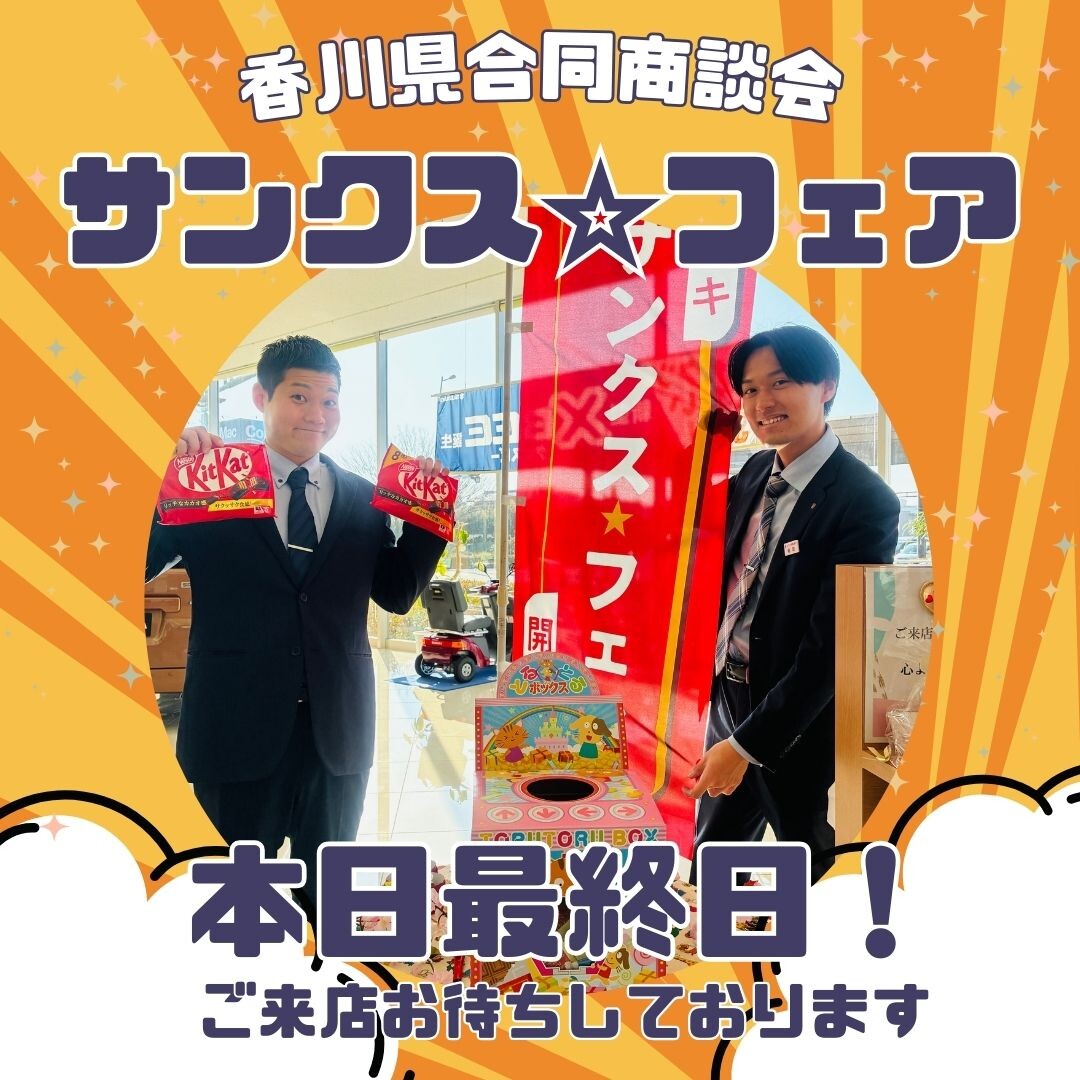 イベント/キャンペーン 2026.02.09 本日ラスト!合同商談会サンクス☆フェア こんにちは スズキアリーナ高松です 2/7(土)より始まりました 香川県合同商談会 サンクスフェア 本日最終日となります この土日はたくさんのお客様に ご来場いただきました ありがとうございました ラスト1日盛り上がっていきますよ~ お時間ある方はぜひ スタッフ一同ご来店お待ちしております