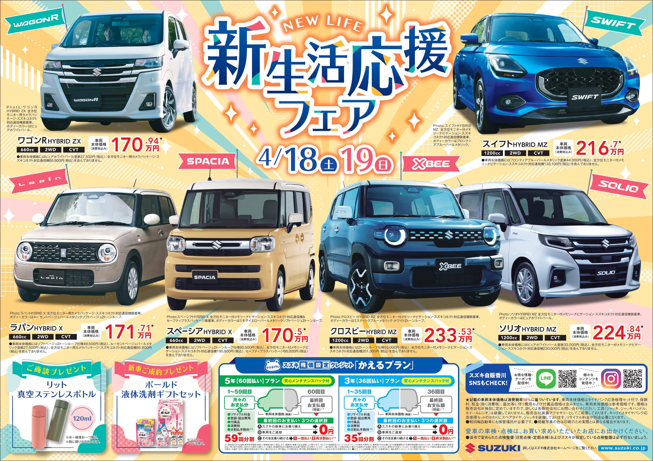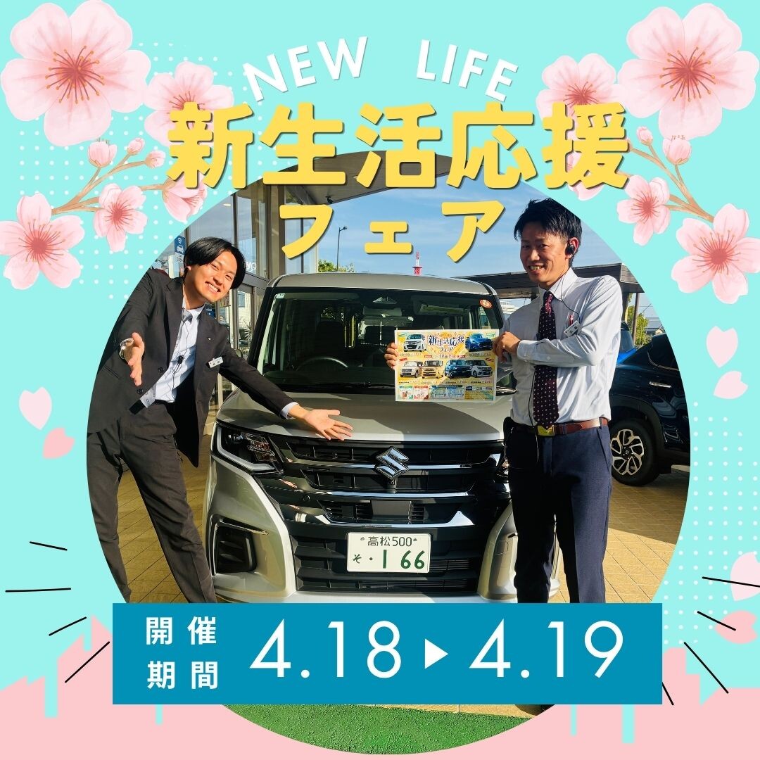 イベント/キャンペーン 2026.04.13 4/18・19☆商談会開催! キャンペーン期間:2026.04.18~2026.04.19 こんにちは スズキアリーナ高松です 今週末4/18(土)・19(日)で 商談会開催します その名も 『新生活応援フェア』 ご商談いただいた方に 真空ステンレスボトル(120ml)プレゼント また、新車ご成約の方には 液体洗剤ギフトセットプレゼント 当店店長・炭山の おすすめ車もありますよ~ 今週末はぜひ スズキアリーナ高松へ