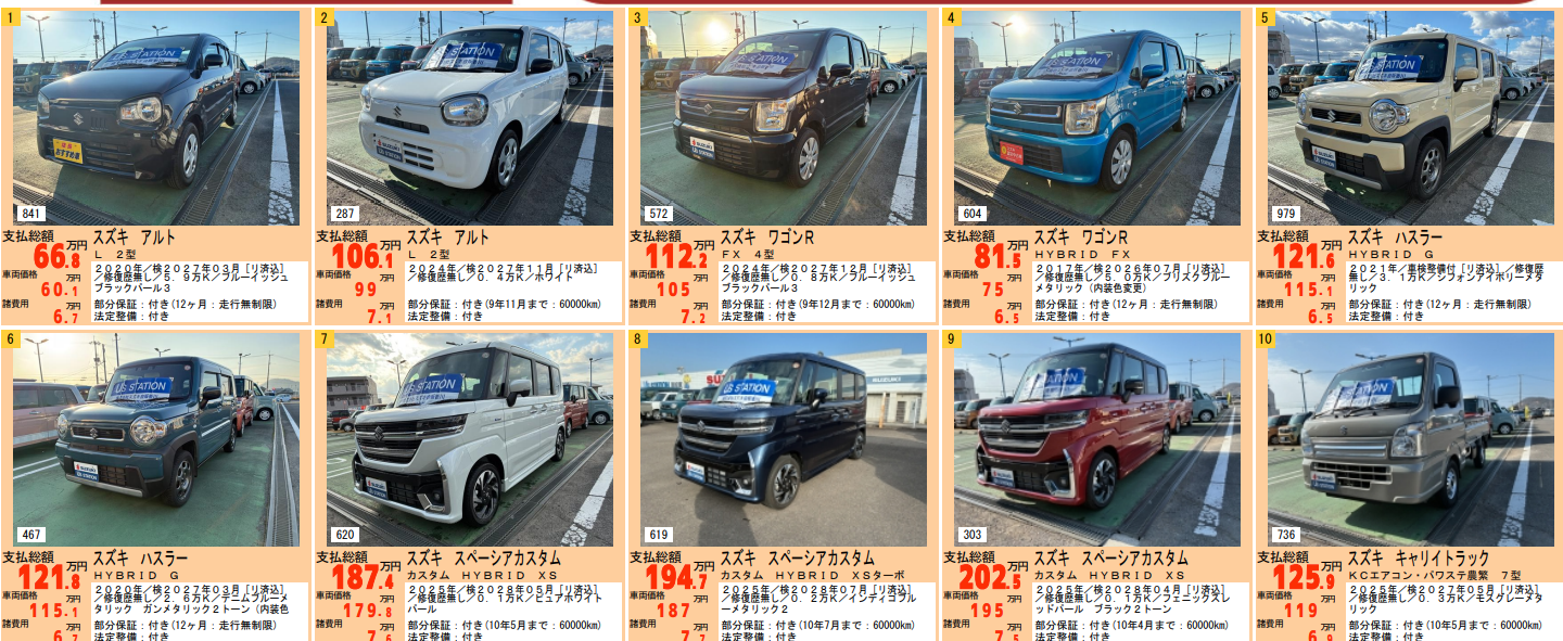 その他 2026.01.22 中古車のことなら高松東営業所へ♪ こんにちは スズキ自販香川高松東営業所です 新しい中古車が続々入庫中♪ 「あのときは気に入るクルマが見つからなかった…」という方も、もしかすると “あなたにピッタリの一台” が今なら見つかるかもしれません 中古車はご縁が大事です 一期一会のクルマたちが、あなたとの出会いを待っています ぜひ、気軽にご来店くださいね! スタッフ一同、お待ちしております (株)スズキ自販香川 高松東営業所TEL: (087)840-3811【定休日】火曜日・第2水曜日