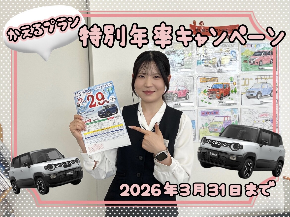 イベント/キャンペーン 2025.10.20 新型クロスビーかえるプラン特別金利キャンペーン中!!試乗車あります☆ キャンペーン期間:2025.10.01~2026.03.31 こんにちは スズキアリーナ屋島店です いつもブログをご覧いただき ありがとうございます 新型クロスビーが発売となり ありがたいことに沢山のお客様から お問い合わせをいただいております 本当にありがとうございます 現在スズキでは 残価クレジット『かえるプラン』で 特別金利キャンペーンを 実施中です キャンペーン中に対象車種を スズキ残価設定クレジット 『かえるプラン』にてご契約いただくと 以下の条件でお取扱いいただけます 通常時(実質年率)3.9% ▼▼▼ 特別手数料(実質年率)2.9% 【期間】2026年3月末 【対象車】クロスビー 是非この機会にご検討ください アリーナ屋島店には 試乗車のご用意もしております 皆様のご来店お待ちしております ご試乗のご予約はこちらから▼▼