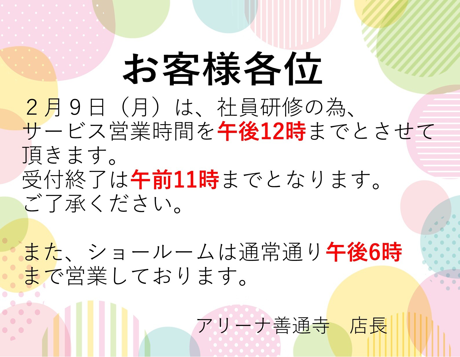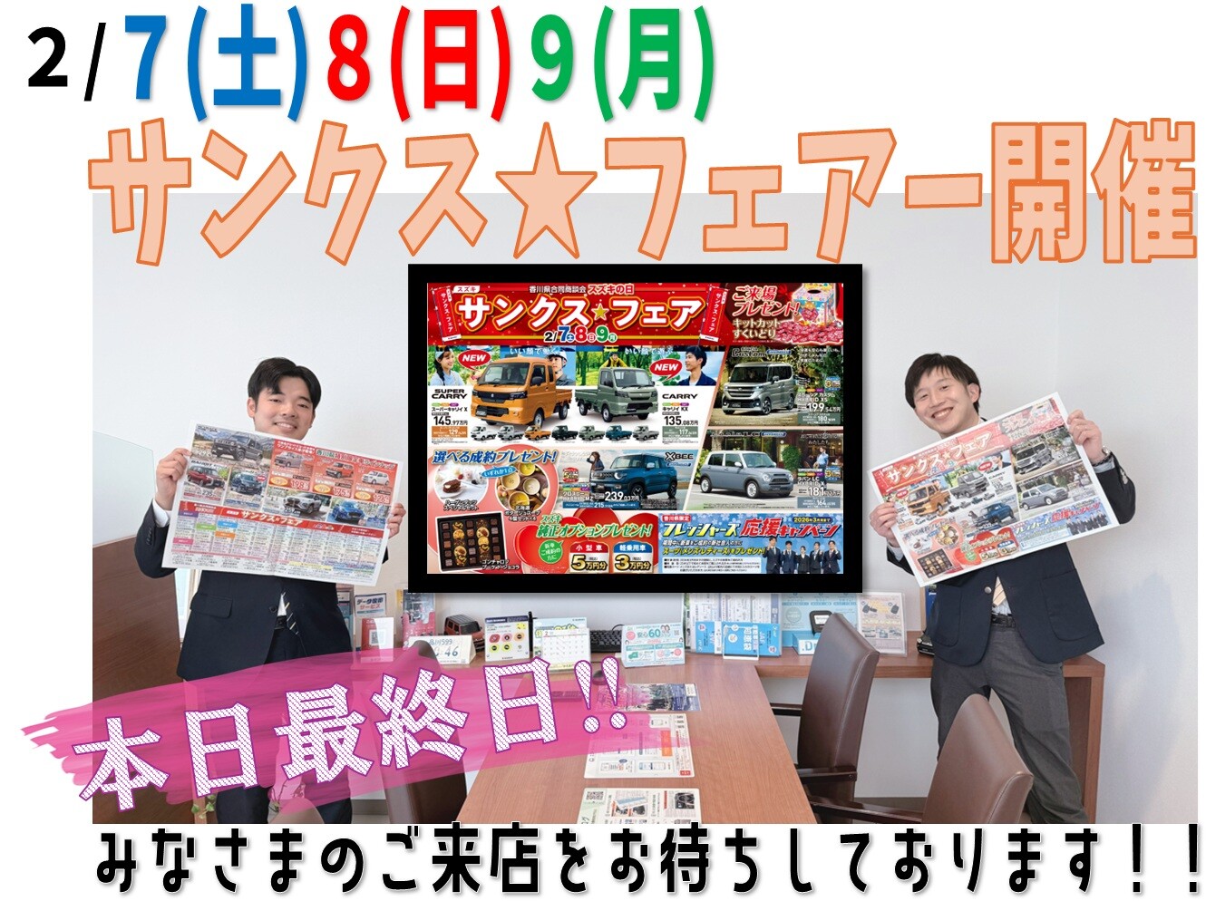 その他 2026.02.09 2月9日営業時間変更のお知らせ アリーナ善通寺 店長の福田です。 2月9日(月)一部営業時間の変更がございます。 サービス社内研修の為、サービス工場の受付時間を、 午後12時までとさせて頂きます。 受付終了は午前11時までとなりますので、ご注意ください。 ショールームの営業は通常通り午後6時までです。 サンクス★フェアー本日最終日‼ ご検討中のみなさま!!!! 本日が最終日です!!!! ぜひ!当店スタッフにご相談ください!!!