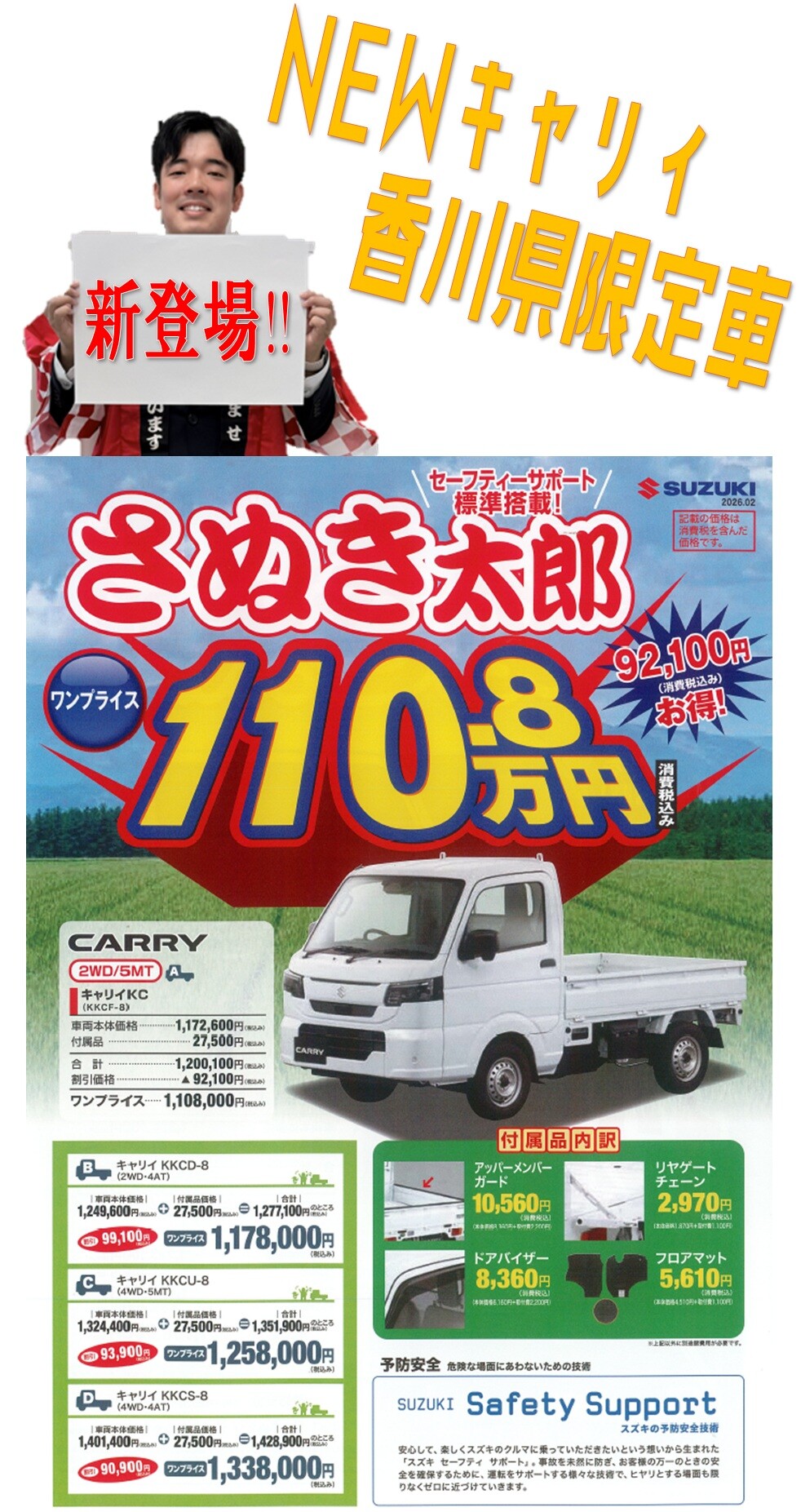 新車情報 2026.02.18 NEWキャリィ★香川県限定車登場‼ アリーナ善通寺 店長の福田です。 大好評‼NEWキャリィが発売になりました‼ みなさまのご要望にお応えして、 香川県限定車が登場!!!!! 大変お得な限定車です‼ ぜひ!当店スタッフにお問合せ下さい。