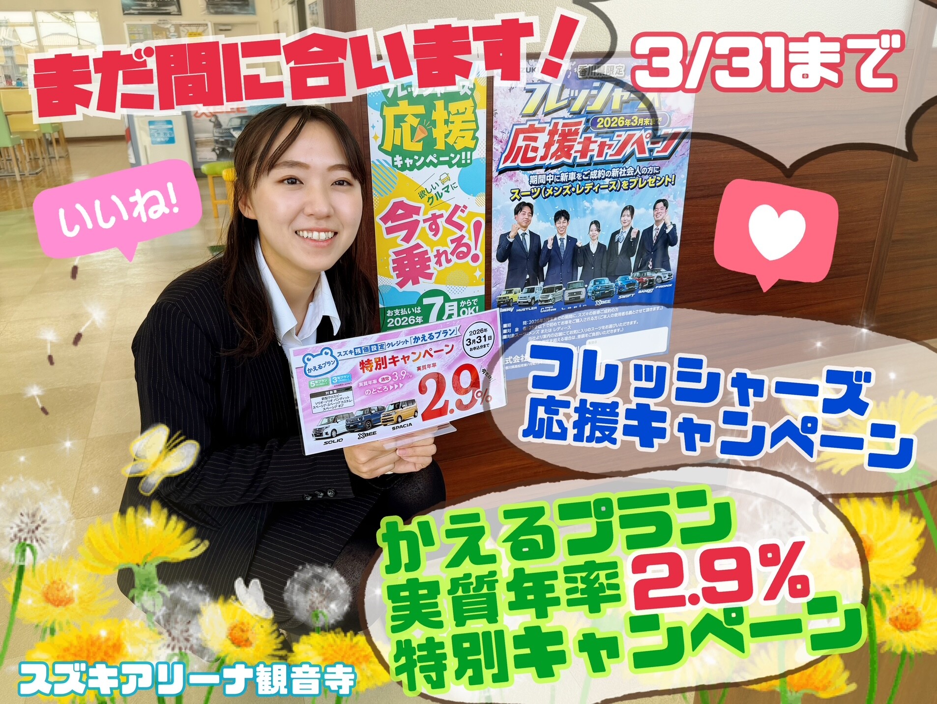 イベント/キャンペーン 2026.03.12 まだまだ間に合います! こんにちは 衣替えしましたか? 新生活の準備しましたか? 新しいお車の準備しましたか? 春の嬉しいキャンペーンのお申込みはまだ間に合います スズキ「かえるプラン」 実質年率2.9% 特別キャンペーンは 3月末まで受け付け中です フレッシャーズ応援キャンペーンも3月末まで まだまだ間に合います 詳しくはスタッフへお問い合わせください ご来店お待ちしております スズキアリーナ観音寺
