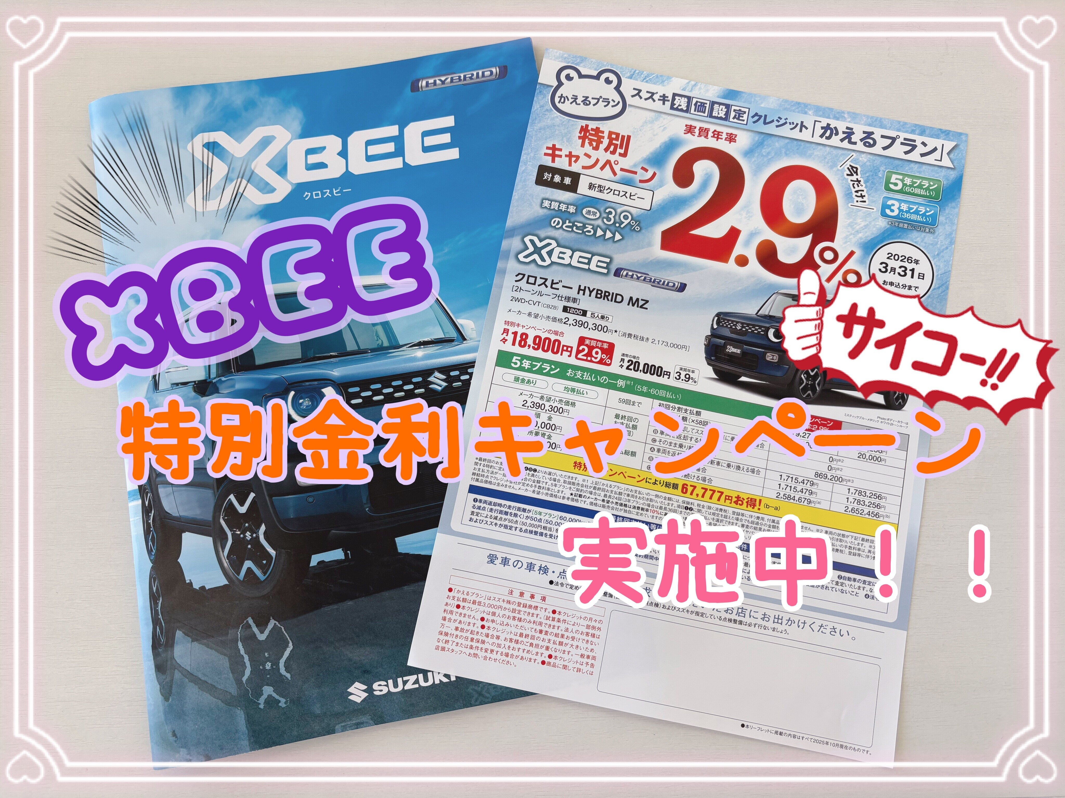 イベント/キャンペーン 2025.10.17 ☆新型クロスビー☆特別金利キャンペーン実施中!! 皆様、こんにちは 大内営業所です 新型クロスビー スズキの残価設定クレジット「かえるプラン」特別金利キャンペーン実施中 期間中にスズキの残価設定クレジット「かえるプラン」で ご契約いただきますと 通常時 (実質年率):3.9% ↓ 今だけ実質年率が2.9%に 【キャンペーン期間】 2026年3月31日(火)お申込分まで 【対象車】 新型クロスビー 是非この機会にご検討ください 皆様のご来店お待ちしております!